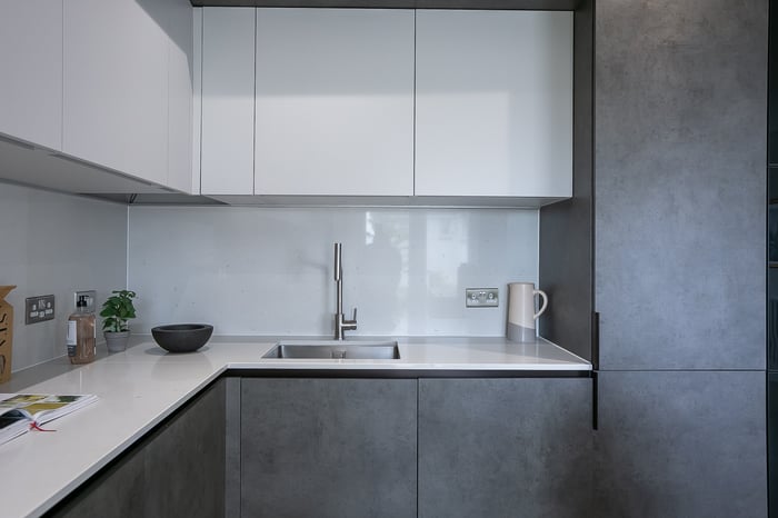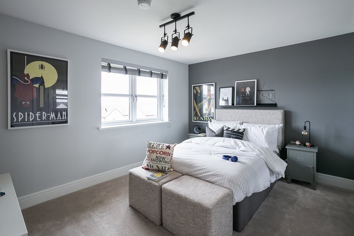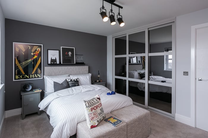 Set off the kitchen, a dedicated utility room offers space for a freestanding appliance, access to a convenient WC, and further garden access. On the upper floor, the master bedroom is set to the front, offering a generous room, with carpeted flooring, a built-in wardrobe with mirror sliding doors, plenty of space for freestanding furniture, and a modern en-suite shower room.