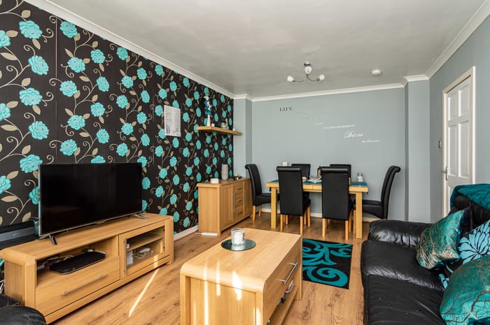 The bright living/dining room features wood laminate flooring, a picture window overlooking the rear garden and has ample space for lounge and dining furniture. With a door opening to the rear garden, the kitchen is fitted with contemporary units, stone effect worktops, a stainless steel sink and tiled splashbacks, with an electric cooker and space and plumbing for further white goods.