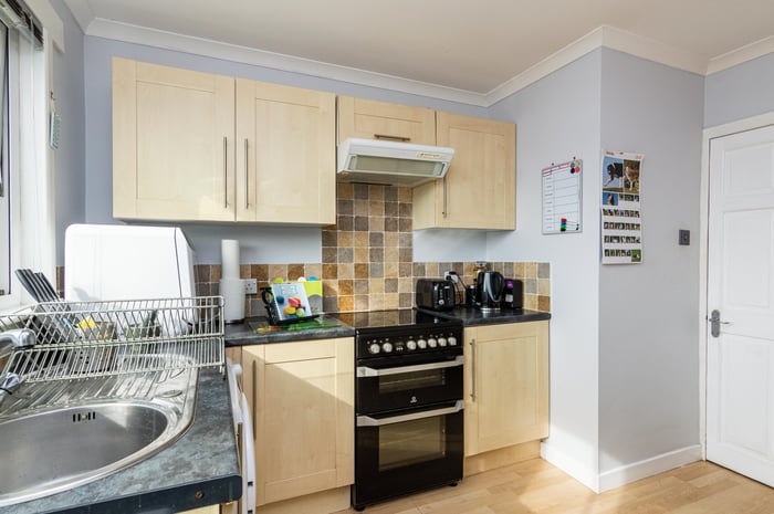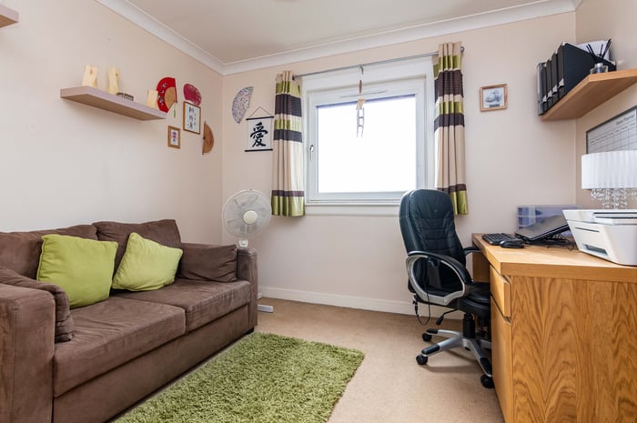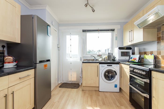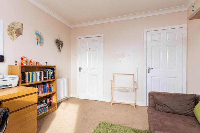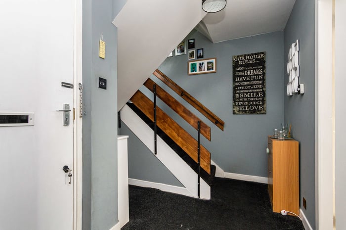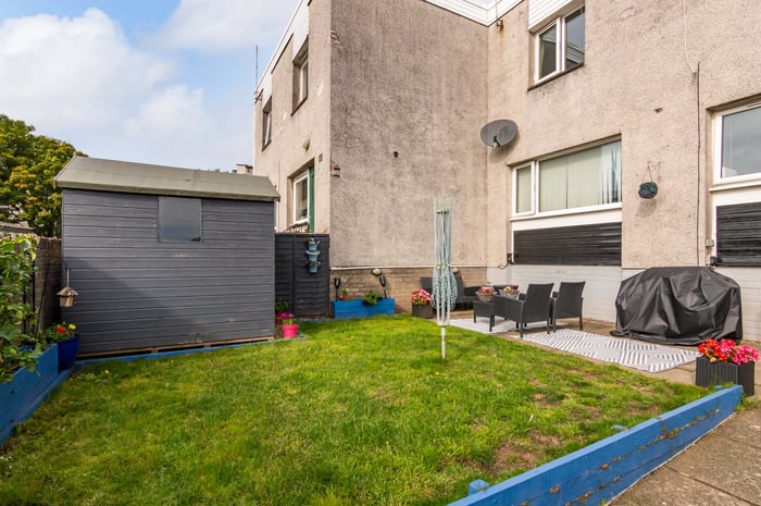 Well-presented, two-bedroom, mid-terrace house with a private garden, set in a quiet residential development, located in the popular seaside town of Broughty Ferry, to the east of Dundee. The entrance hall has two storage cupboards, carpeted flooring and stairs leading up to the first-floor landing.