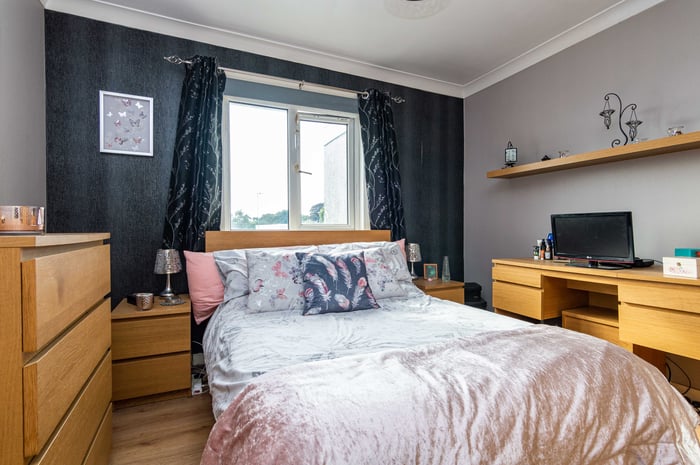 Upstairs, rear-set bedroom one features wood laminate flooring and a pendant light fitting, whilst bedroom two has carpeted flooring and a built-in wardrobe. Completing the accommodation, the bathroom is fitted with a modern white three-piece suite with a rain-head mains shower over the bath, a hidden cistern toilet, integral storage and modern panel splash walls.