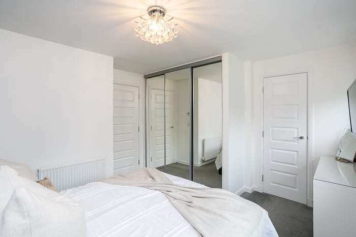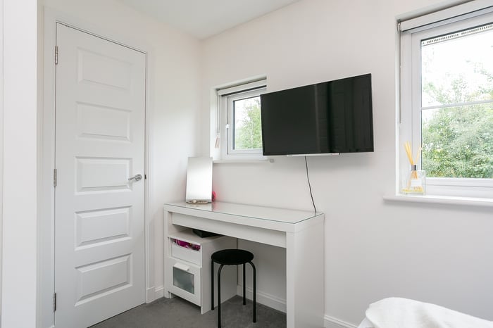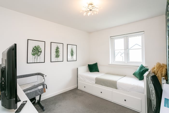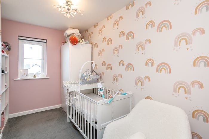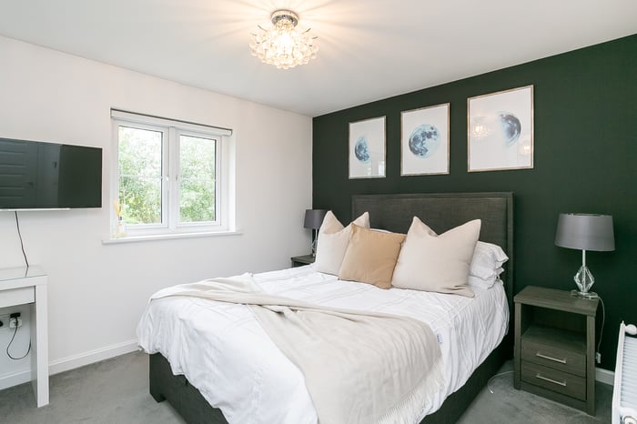 On the first floor, the generous main bedroom is set to the front, and includes a built-in mirrored wardrobe, a deep storage cupboard, carpeted flooring and a TV point. Two further, flexible bedrooms are set to the rear, both with carpeted flooring and central light fittings.