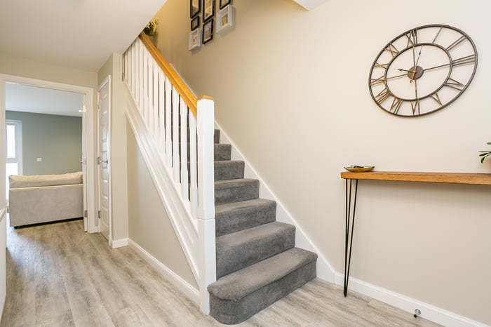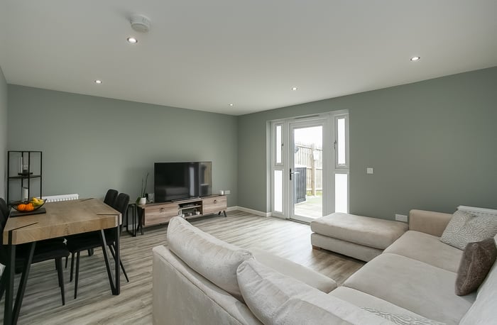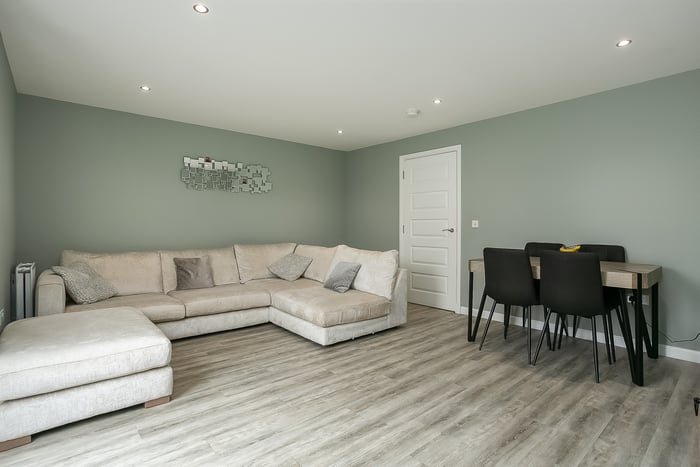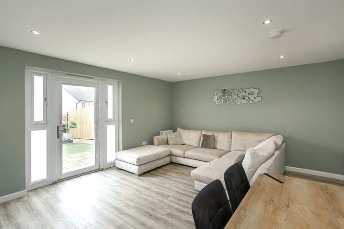 A welcoming entrance hall gives access throughout the ground floor and to the carpeted stairway, and features a built-in cupboard, whilst high-quality flooring continues into the lounge. Set across the rear of the floor plan, the reception room has ample space for lounge and dining furniture, and features a patio door to the rear garden and recessed spotlighting.