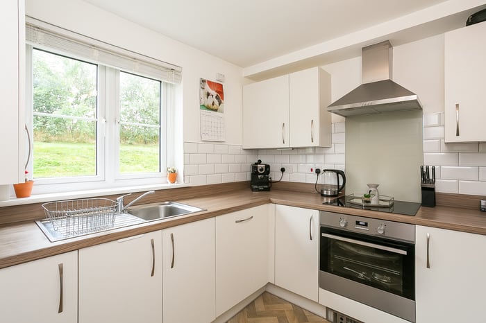 Front-facing, the kitchen includes wood-effect worktops, with matching upstands, a sink with a drainer, an integrated dishwasher, a fridge/freezer, an electric oven and a ceramic hob. Set internally off the hall, a WC is fitted with a two-piece suite and gives access to the utility cupboard.