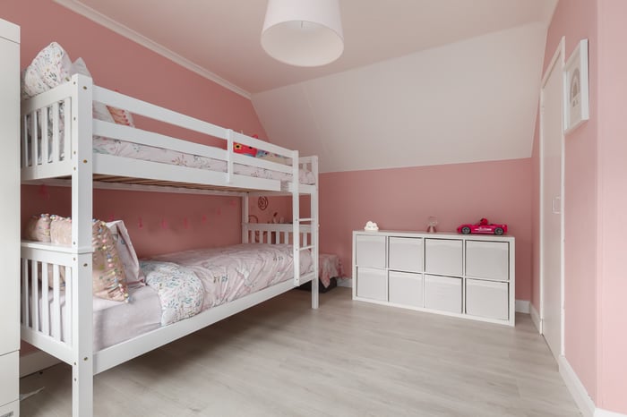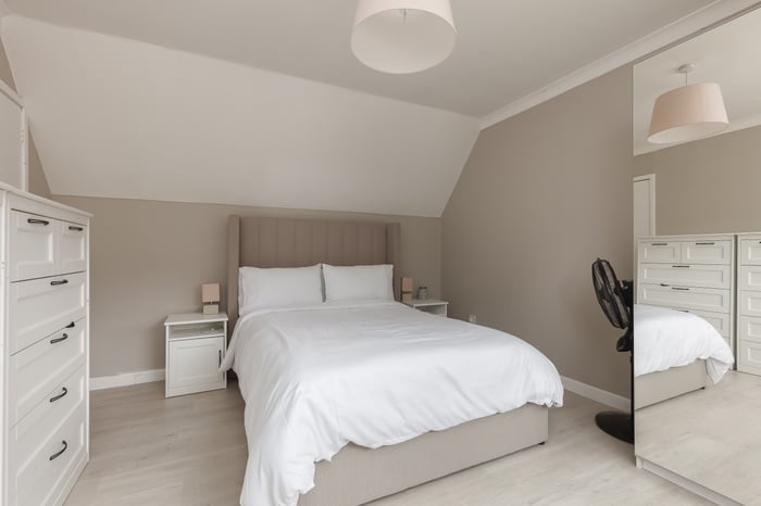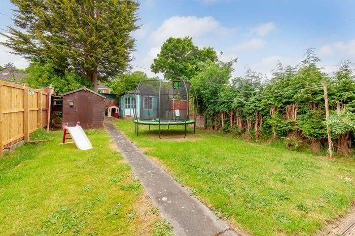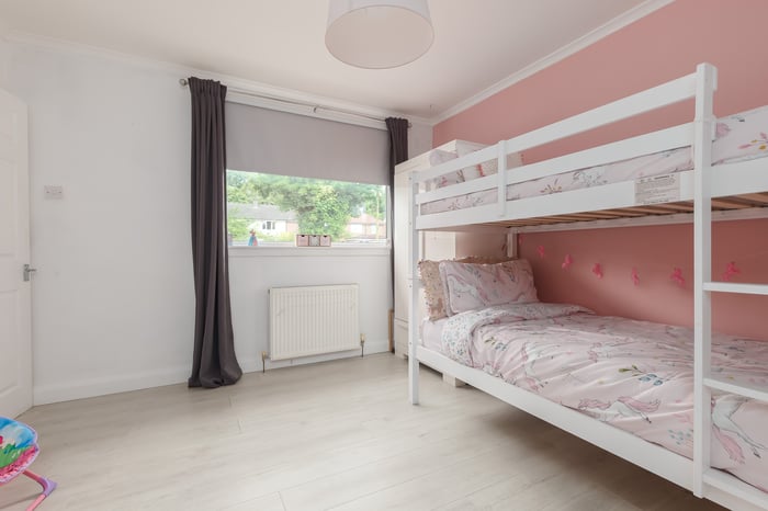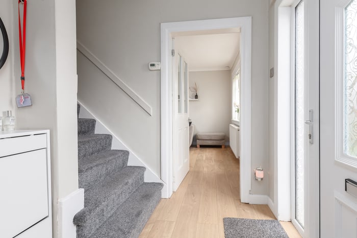On the upper floor, two good-sized double bedrooms are set adjacent, overlooking the rear garden and featuring wood-effect flooring and built-in wardrobes.