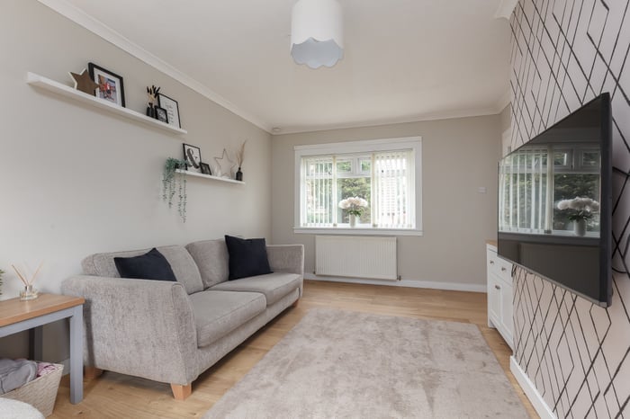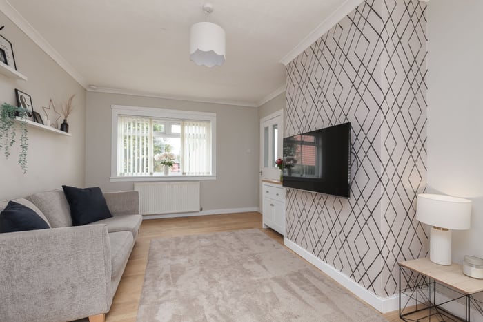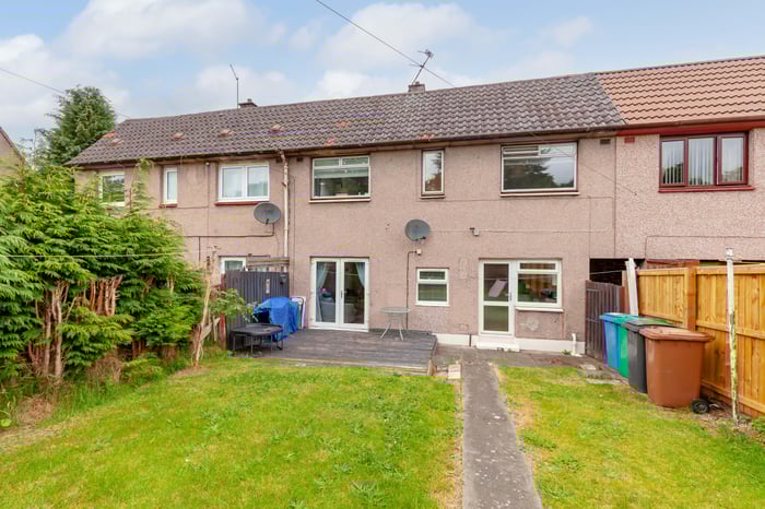 Immaculately presented, two-bedroom, mid-terrace villa, with front and rear gardens. Located in a quiet and established residential area, south of Glenrothes centre, Fife. A welcoming entrance affords access to the carpeted stairway and the ground-floor rooms, with ample space for outerwear.