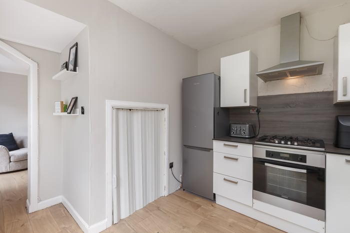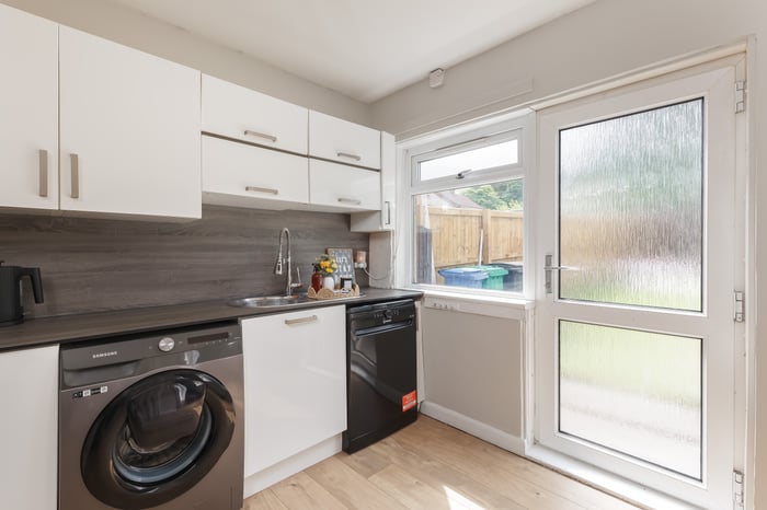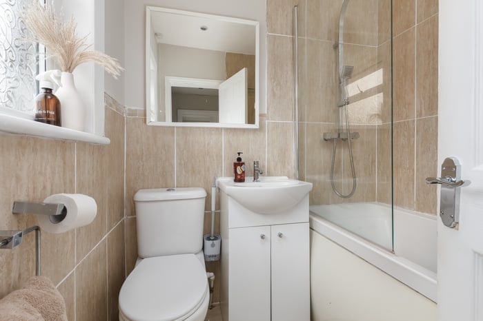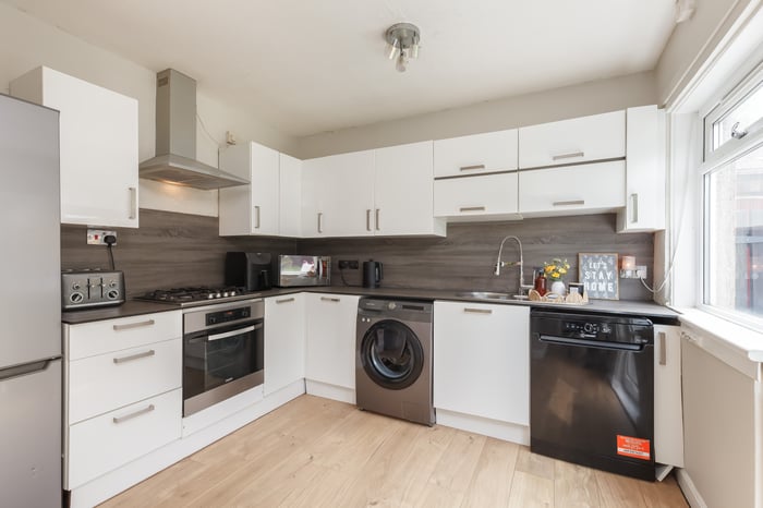 Modern fitted units include wood-effect worktops with matching splashbacks, a sink with a drainer and spray-pull tap, and an integrated oven and gas hob, wth further space for freestanding appliances. Completing the ground floor, a family-sized bathroom is fitted with a stylish three-piece suite including a rainfall shower over the bath and tiled splash walls.
