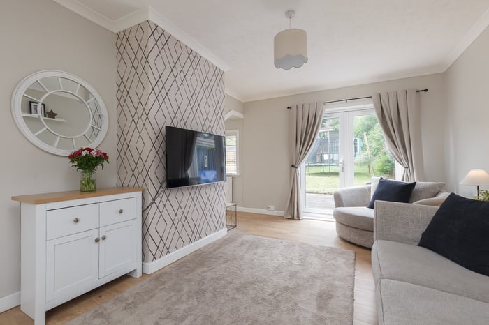 Enjoying a dual-aspect, flooding the room with natural light, a tastefully finished living room has a feature wall with a wall-mounted TV point and twin doors leading to the southerly-facing rear garden. Continuous wood-effect flooring flows seamlessly into the kitchen, providing further garden access, ideal for family time and entertainment.