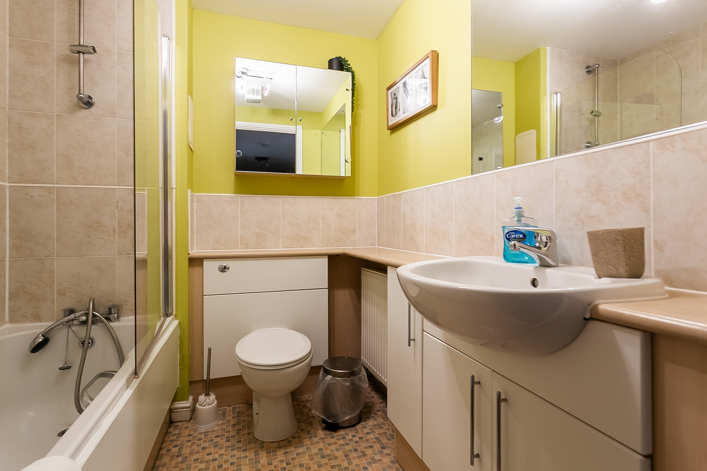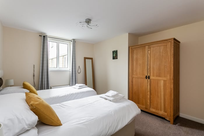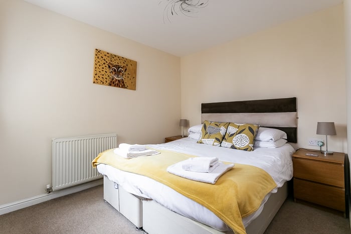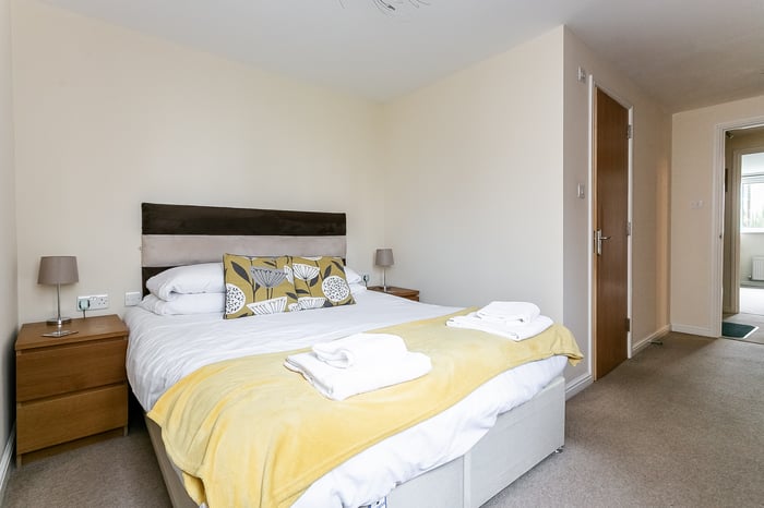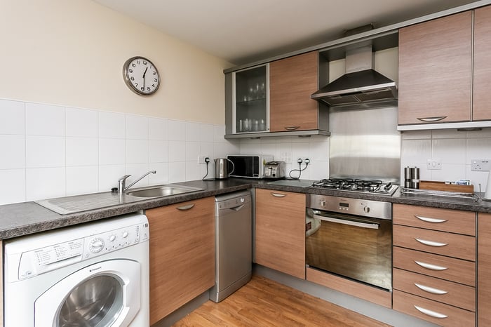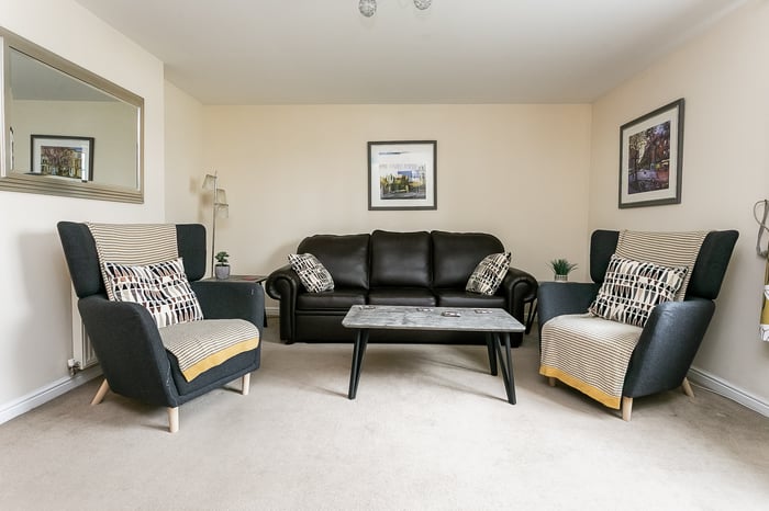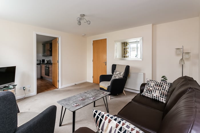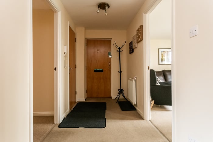 The second bedroom is also well-proportioned, featuring carpeted flooring and a central light fitting, making it ideal as a guest room, home office or additional bedroom. Completing the property, the three-piece fitted bathroom is located off the hallway, next to a built-in storage cupboard, and features tiled-effect flooring, a central light fitting and a tiled splashback surround.