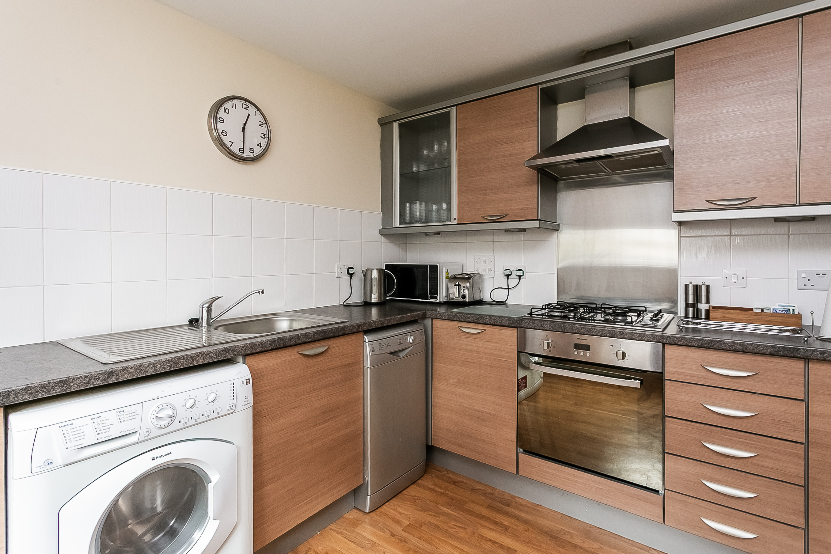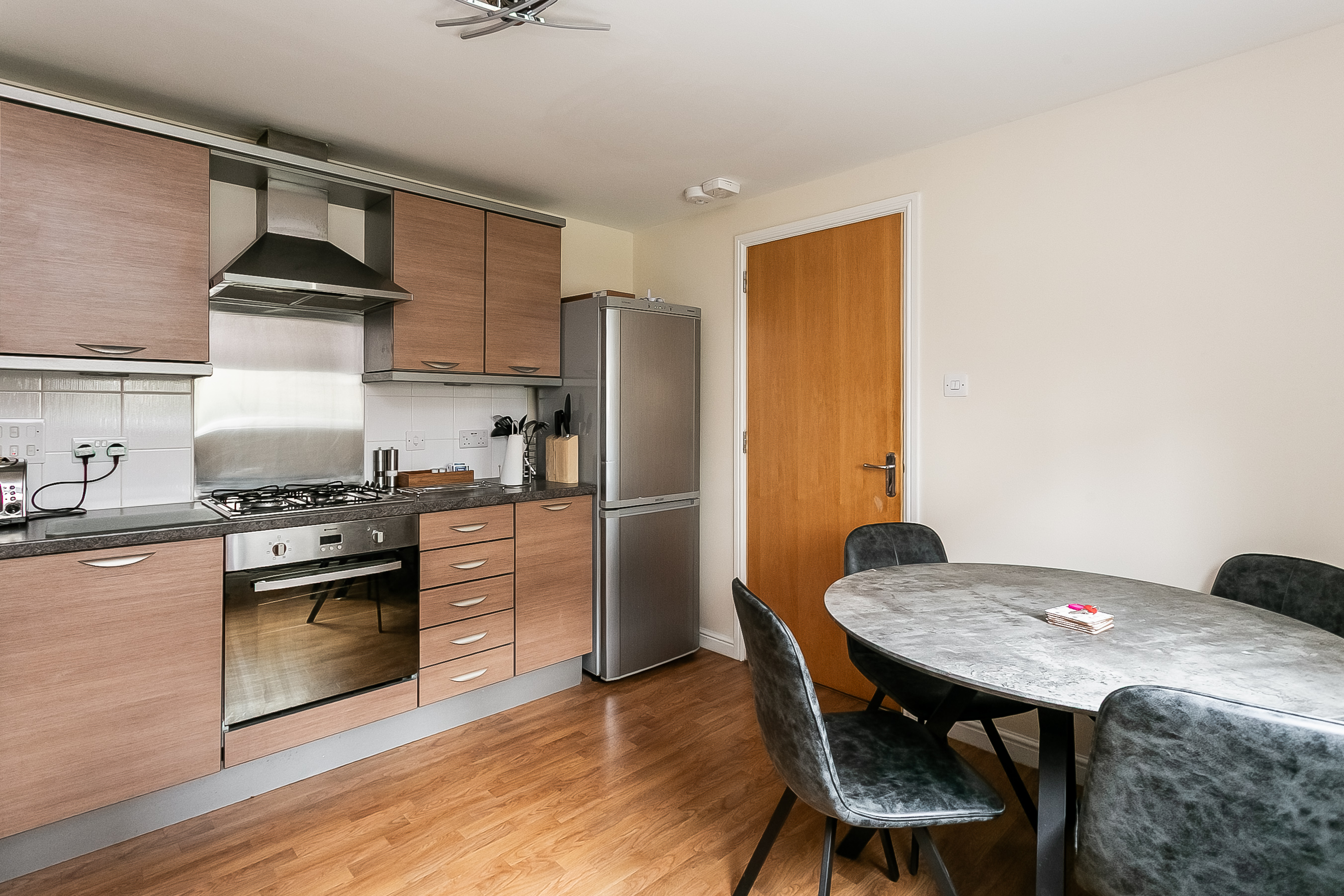 It also benefits from a central light fitting, a sink with a drainer and space for dining. Integrated appliances include an oven and a gas hob with a canopy extractor above.