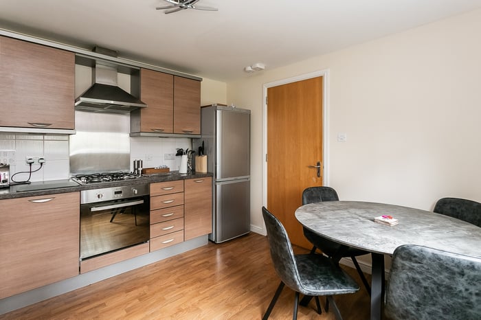 There is also ample space for a range of lounge furnishings. Accessed from the living room, the modern fitted kitchen/dining room is finished with wood-effect flooring, stone-effect worktops and a tiled splashback.