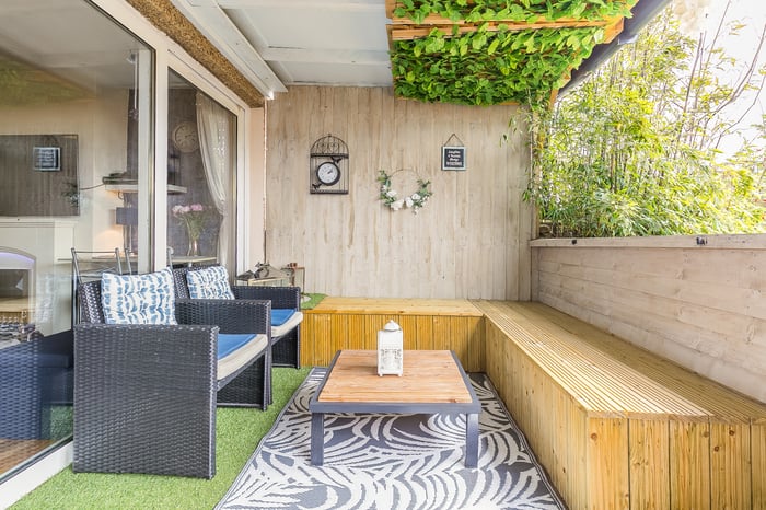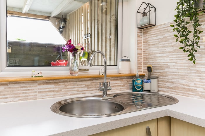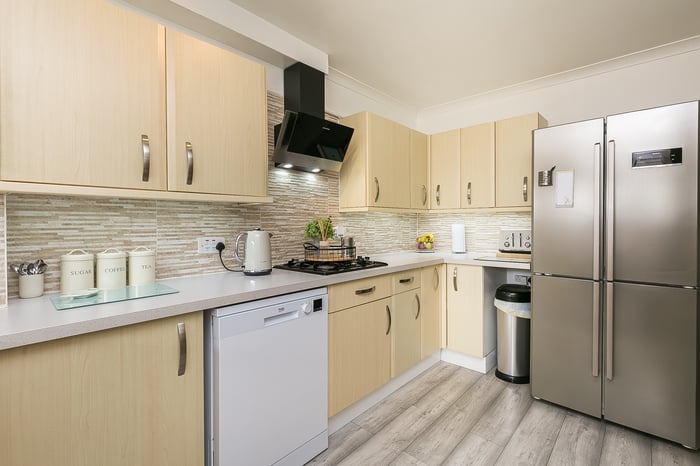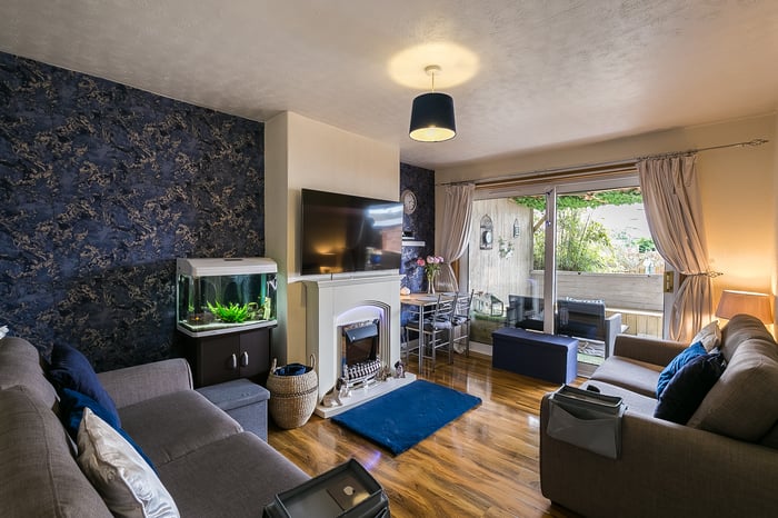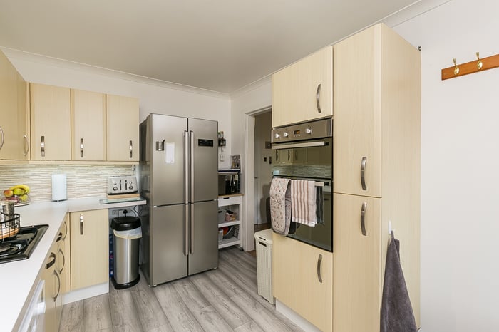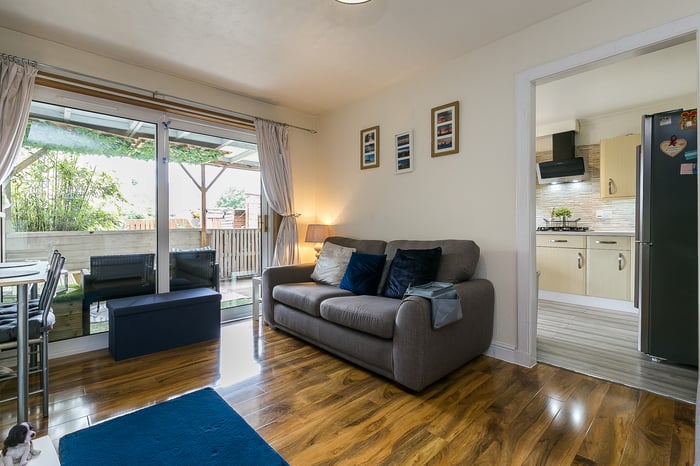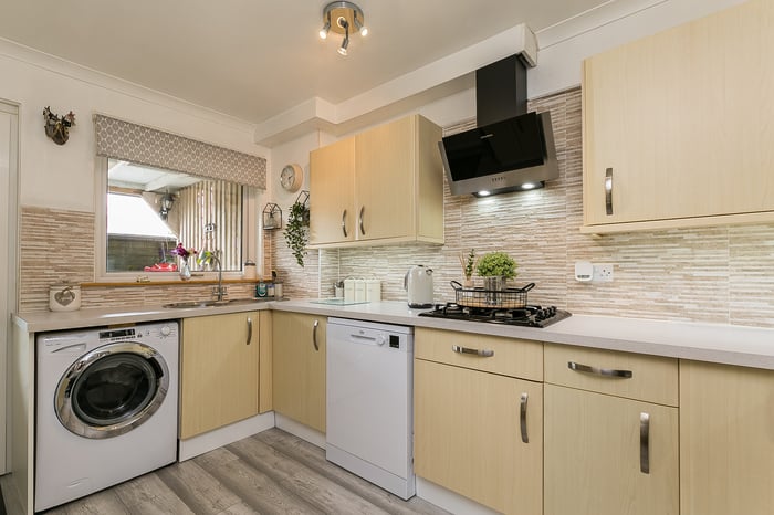 Set off the living room with further access to the rear wood decked patio, the kitchen is fitted with modern units, stone effect worktops and a stainless steel sink with drainer. Appliances include an integrated oven, extractor hood, gas hob and washing machine.