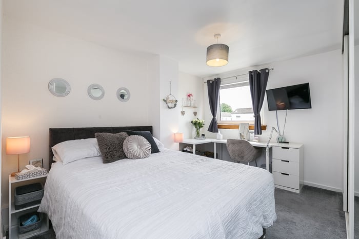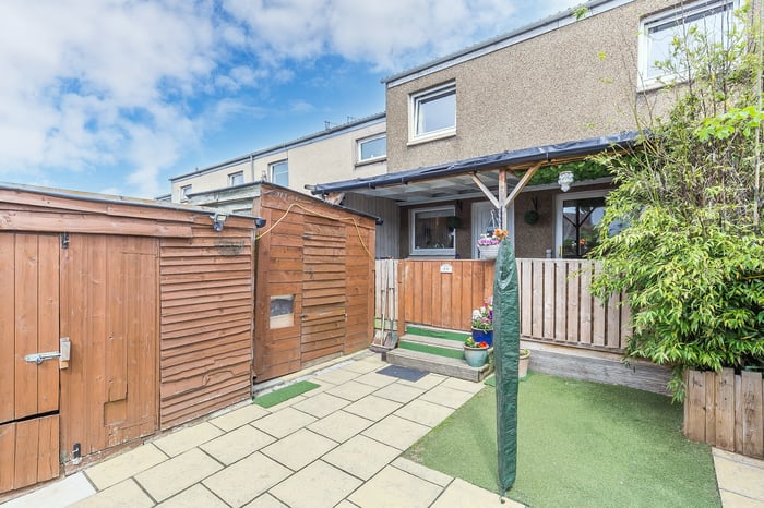 Light and tastefully presented, three-bedroom, mid-terrace family home with gardens. Located in an established residential area in the historic market town of Haddington, East Lothian. The entrance hall gives access to the majority of the ground floor and opens to the rear-facing living room with wood-effect flooring, a feature fireplace, and patio doors leading to the wood decked patio.