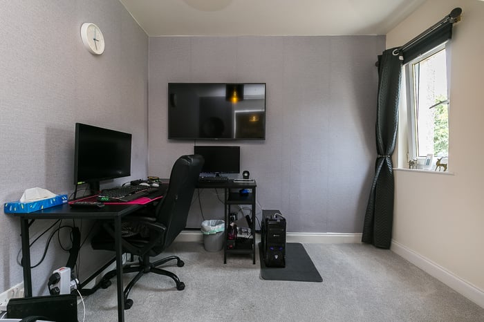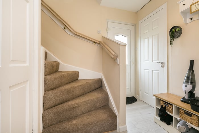 Set to the front, bedroom three is complete with carpeted flooring and central light fitting, a W/C is set internally off the hall with a modern two-piece suite. Upstairs, bedroom one is finished with carpeted flooring, a central light fitting and a large fitted wardrobe, bedroom two comes with carpeted flooring, a central light fitting and ample space for freestanding bedroom furniture.
