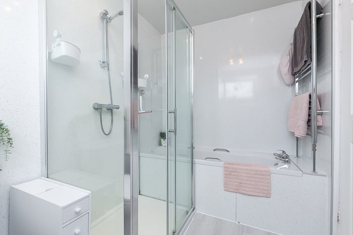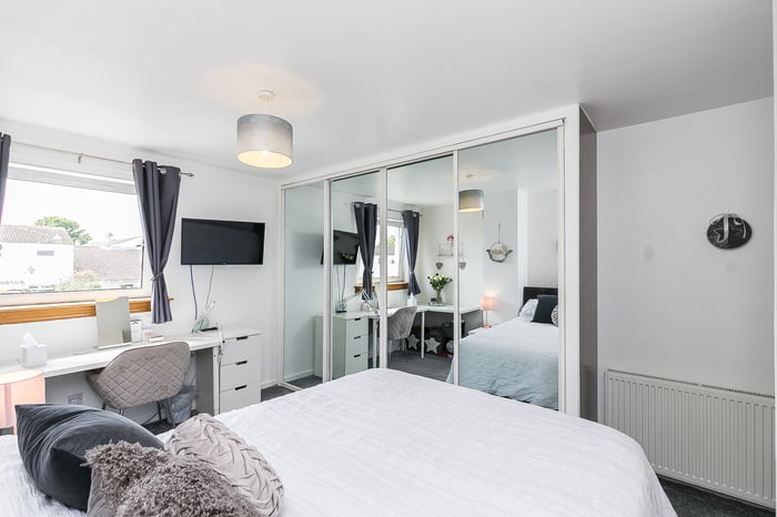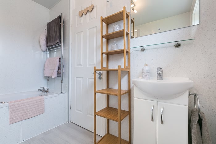 Completing the accommodation, the modern family bathroom is fitted with a three-piece suite, a large shower cubicle, panelled splash walls and a ladder-style radiator.