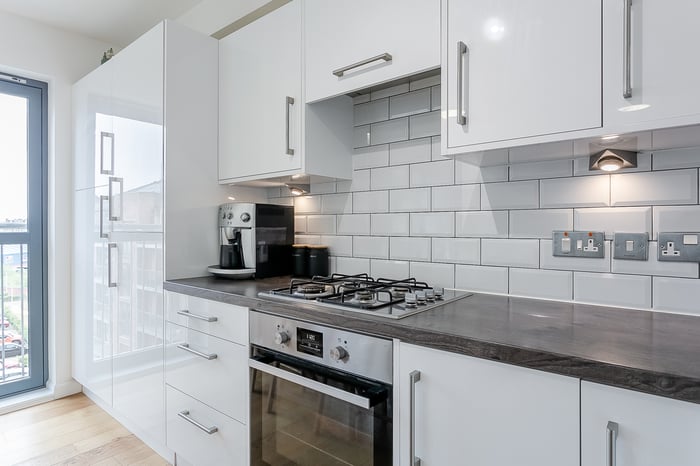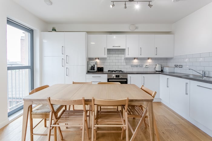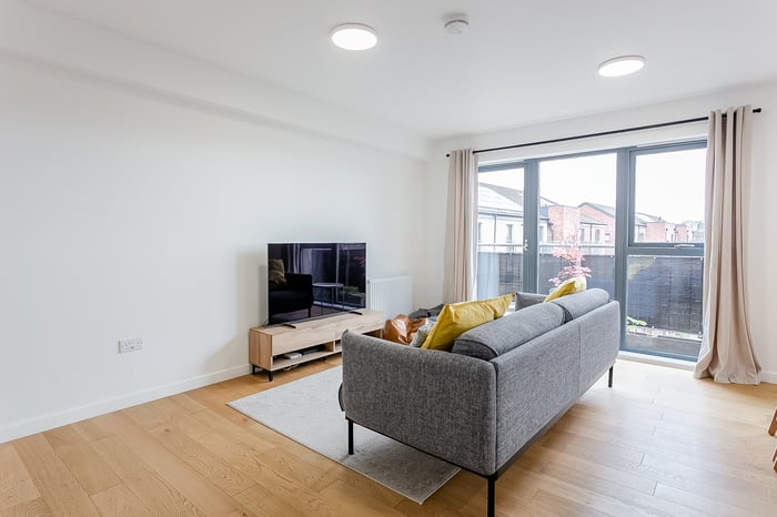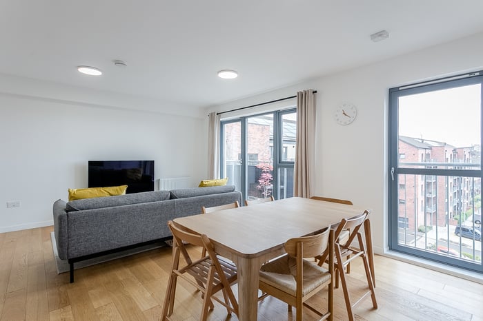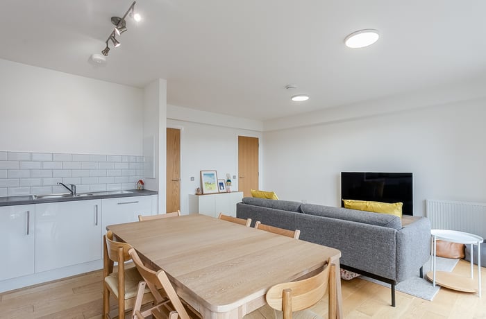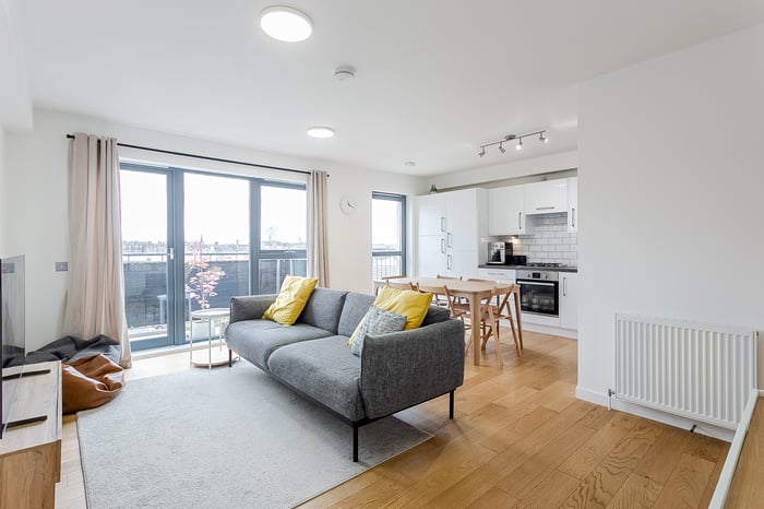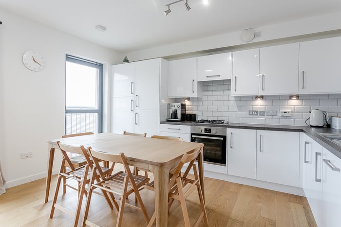 The open-plan living room and kitchen create an ideal space for entertaining, with a balcony extending from the side of the living area. The kitchen is fitted with wood-effect worktops, a tiled-effect splashback, a stainless steel sink with drainer, and a range of integrated appliances including an oven with gas hob and canopy, dishwasher, washing machine, and fridge/freezer.