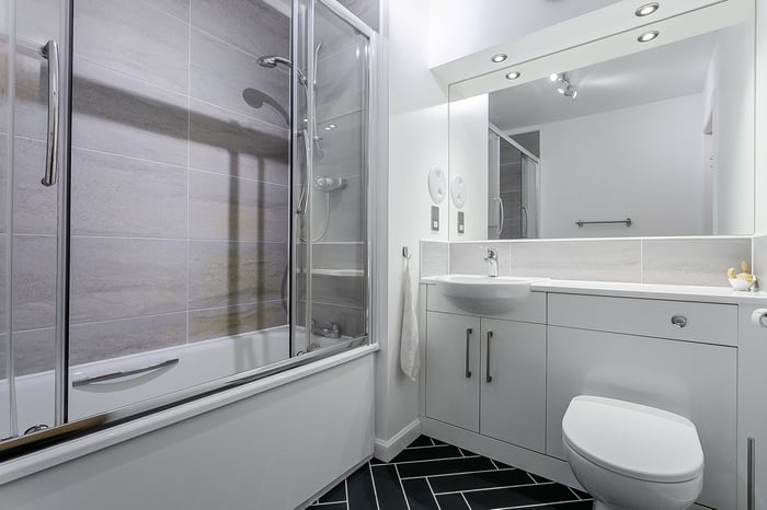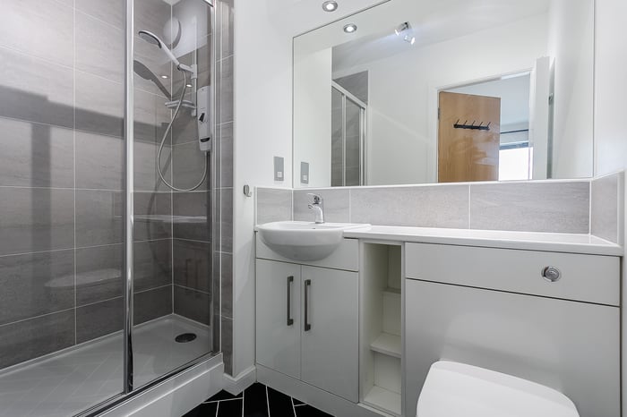 Bedroom one is finished with carpeted flooring, light décor, and a built-in cupboard, and further benefits from an en suite three-piece shower room with a cubicle. Bedroom two features wood-effect flooring, and set opposite is the family bathroom, comprising a modern three-piece suite with a shower over the bath.