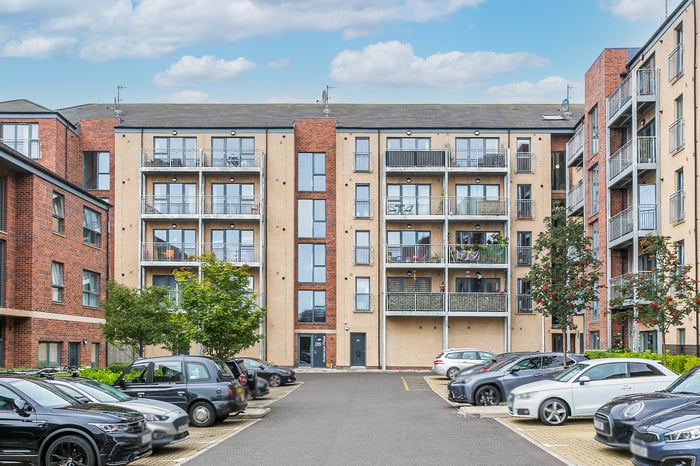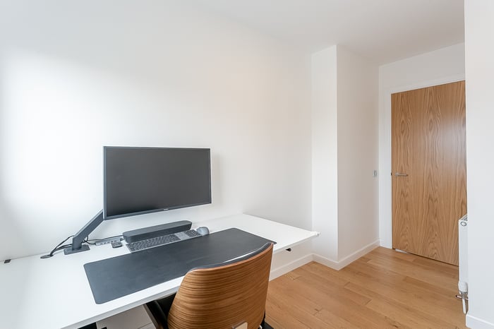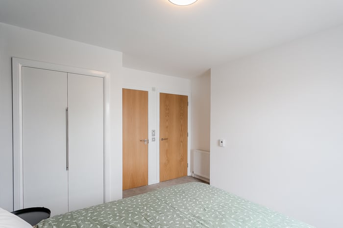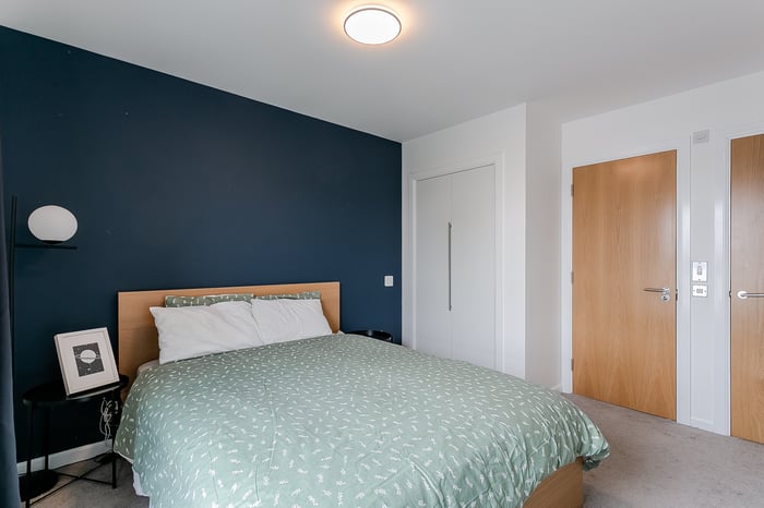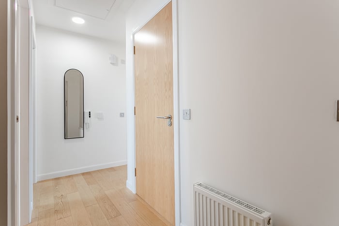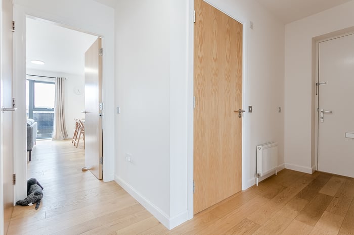 Immaculately presented, two-bedroom, fourth-floor (top) apartment, with a private balcony and city skyline views. Forming part of a modern, factored residential development, adjacent to the Water of Leith, in Edinburgh’s Bonnington area, north east of the city centre. The property is entered via a welcoming hallway with wood-effect flooring that flows throughout and provides access to all rooms.