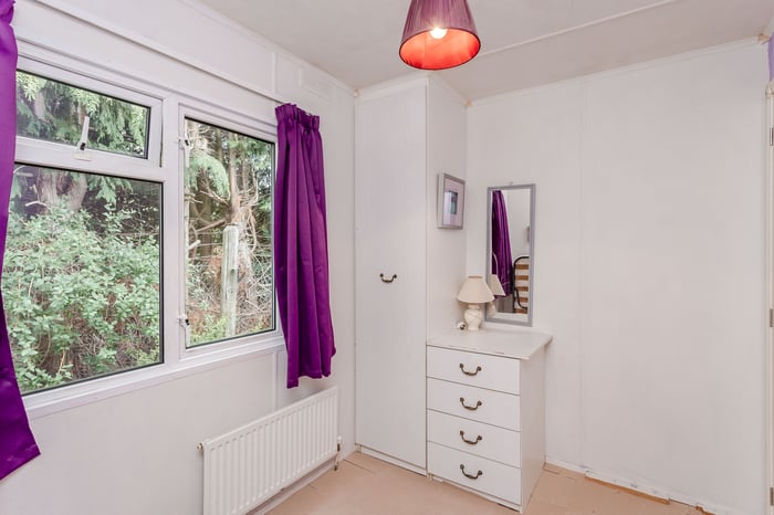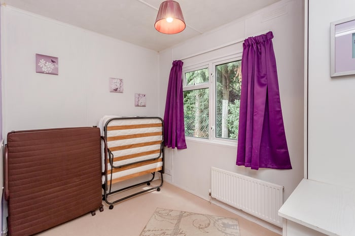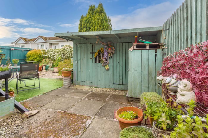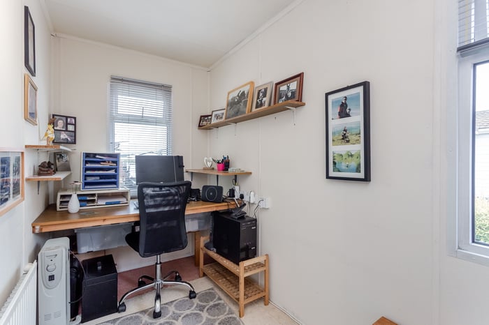 Patio doors lead directly to the rear garden, creating a seamless indoor-outdoor living experience. Just off the lounge, a versatile office space provides the ideal setting for home working or a quiet retreat. Two well-proportioned bedrooms sit adjacent to the rear, both tastefully finished and benefiting from built-in wardrobes for excellent storage, while a third single bedroom is set to the side.