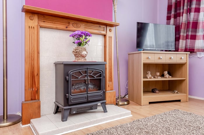 A welcoming side entrance opens into a spacious and well-appointed kitchen, complete with a range of wall and base units, a sink with drainer, and a selection of freestanding appliances including a gas cooker, fridge/freezer, washing machine, and dishwasher. At the front of the property, the bright and generously sized living room boasts a feature wall with a fireplace surround with a stove, two ceiling light fittings, and ample space for both seating and dining.