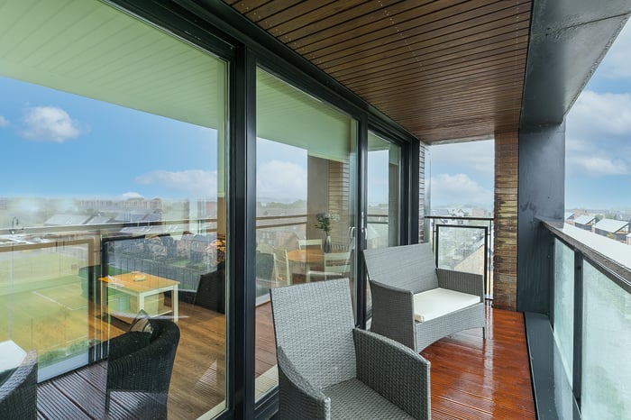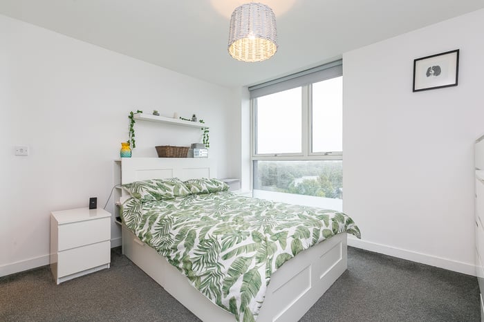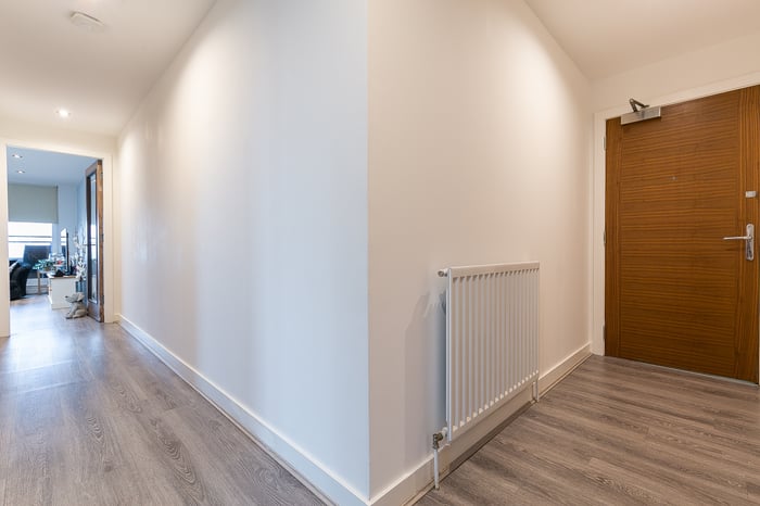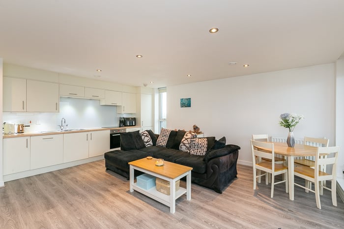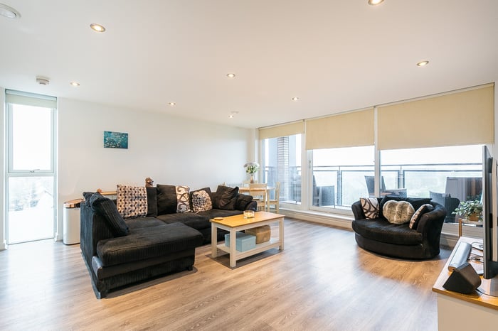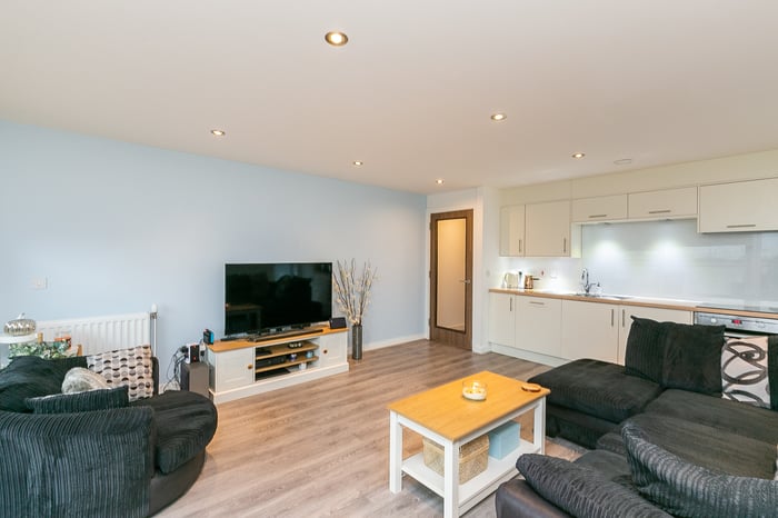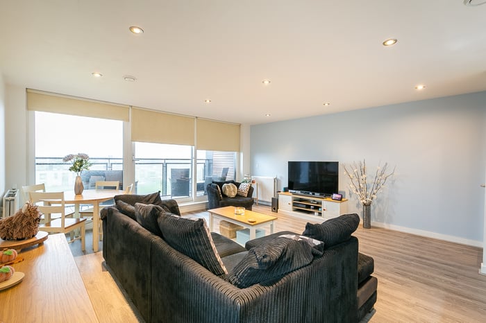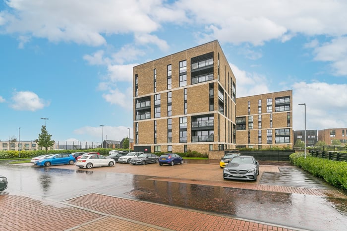 Immaculately presented and spacious, two-bedroom, corner-aspect, fifth-floor apartment with a balcony terrace and superb city skyline views. Set in a modern residential development located riverside, in the Dalmarnock area just south of Glasgow city centre. A welcoming hall gives access throughout, including a walk-in storeroom and separate cupboard, and features the secured entry handset. Quality flooring continues from the hallway into the front-facing, open-plan living room/kitchen, offering a spacious living room and a patio door to the private terrace.