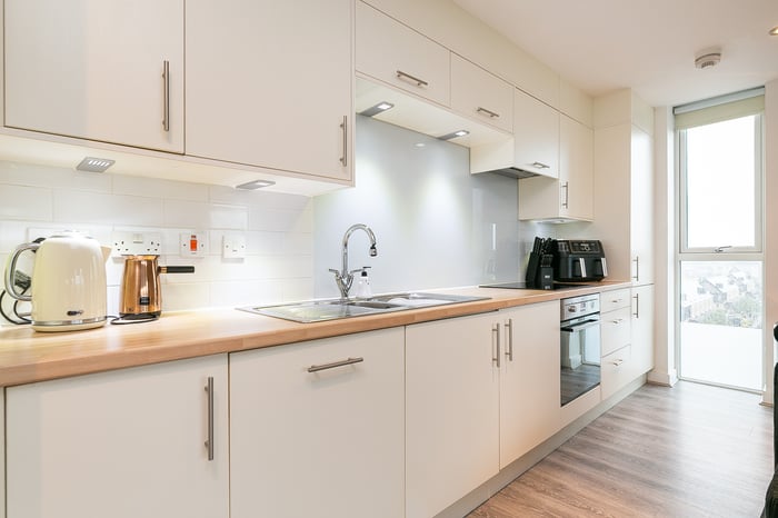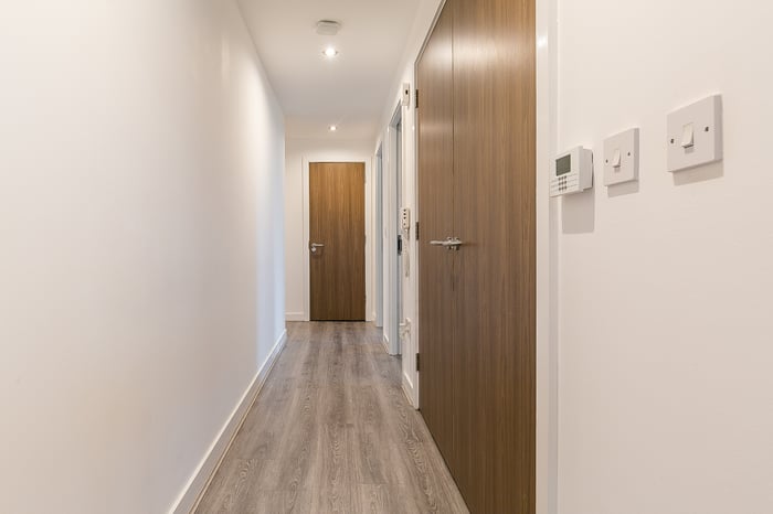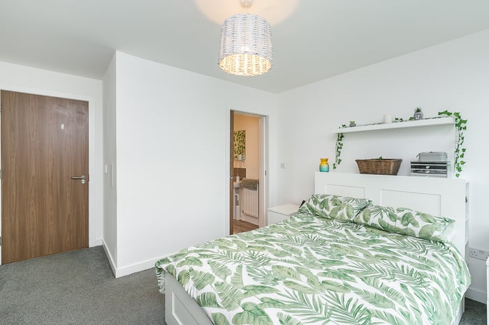 The stylish kitchen is fitted with modern units, wood-effect worktops with panelled splashbacks and a sink with a drainer. Appliances include an integrated oven and an induction hob with a canopy above, a washing machine, dishwasher and fridge/freezer. Two well-proportioned double bedrooms are set to the rear with carpeted flooring.
