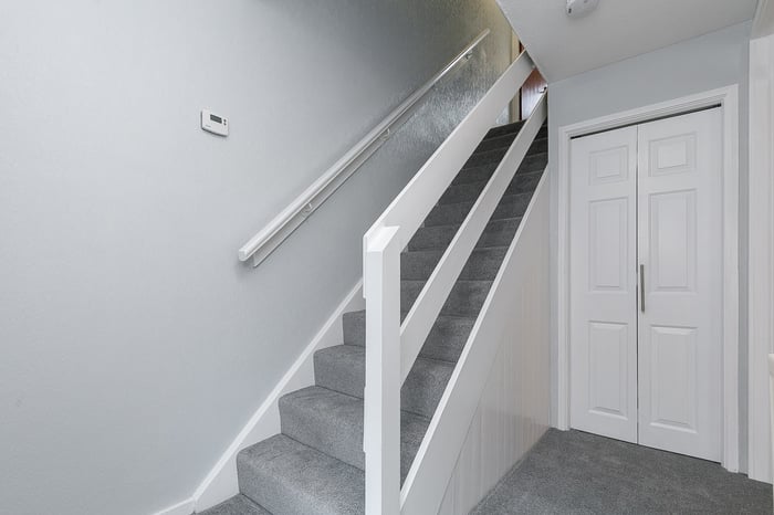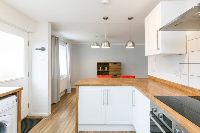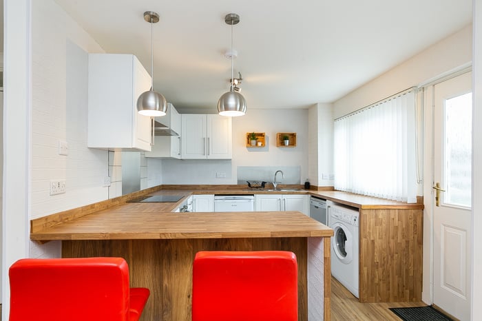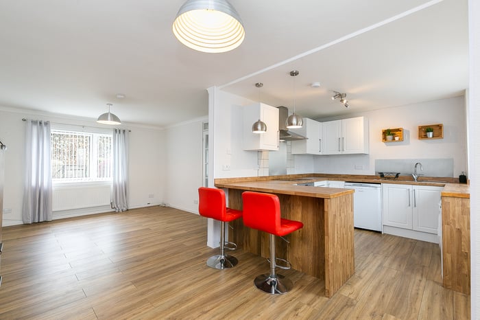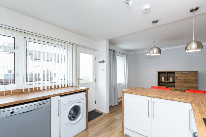 Beautifully presented, three-bedroom, mid-terrace home with gardens, forming part of a desirable, quiet and leafy cul-de-sac. Located in an established residential area of the popular town of Penicuik, Midlothian. A welcoming entrance affords access to the carpeted stairs leading to the upper hall, a built-in storage cupboard, and the open-plan living/dining room and kitchen. With dual aspect, the living room area features wood effect flooring continuing into the dining area and kitchen, whilst the rear-set kitchen features a door accessing the garden.