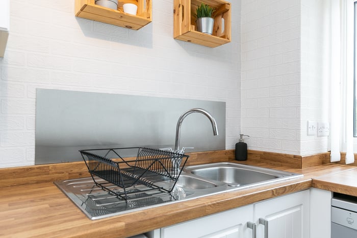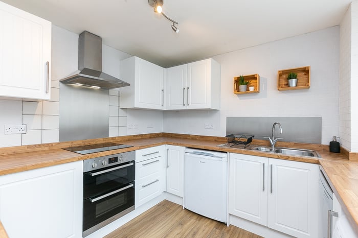 Modern fitted units include wood effect worktops with matching upstands, a sink with drainer and a stainless steel splashback; with appliances including an integrated double oven and electric hob with an extractor hood and a tiled and stainless steel splashback; and a freestanding washing machine, fridge and dishwasher. On the upper floor, bedrooms one and two are set to opposite aspects, similarly well-sized and finished with carpeted flooring, central light fittings, and built-in wardrobe storage. Whilst a nursery bedroom is set to the front, and offers a flexible space for a potential home office/study.