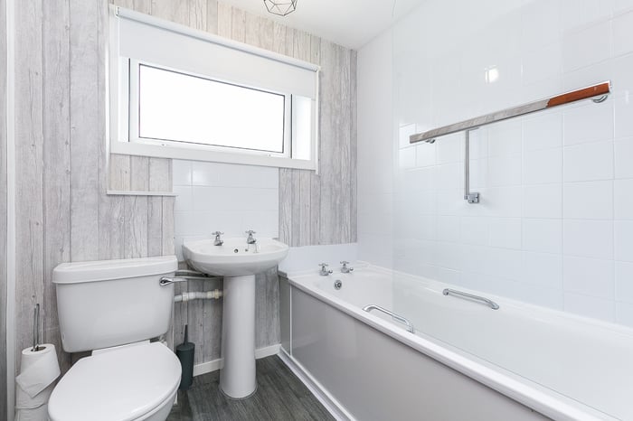 Completing the accommodation, the bathroom is set to the rear, fitted with a three-piece suite including an electric shower over the bath with tiled splash walls, a central light fitting, and wood effect flooring and walls.