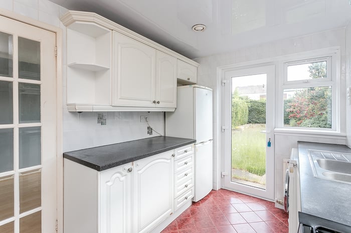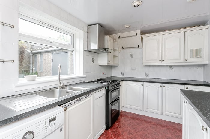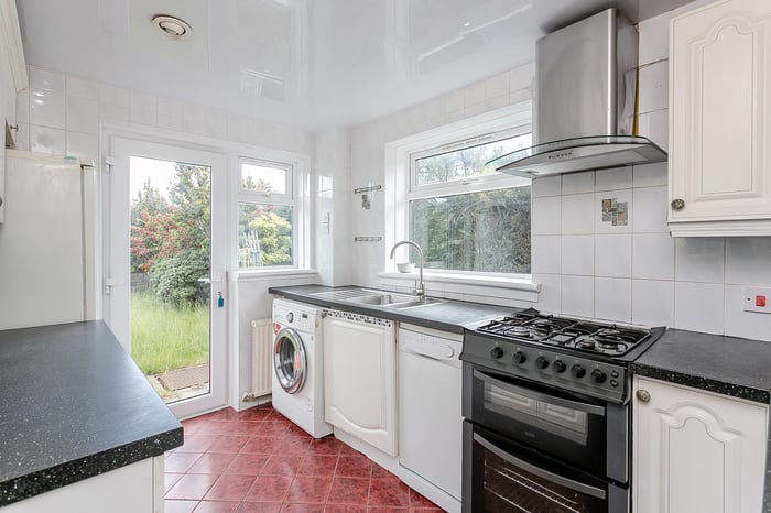 To the rear, the kitchen offers direct access to the garden and is fitted with traditional units, laminate worktops, a stainless steel sink, and tiled splashbacks. Appliances include a gas cooker, washing machine, slimline dishwasher, and fridge/freezer—providing everything needed for daily convenience.