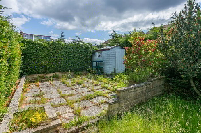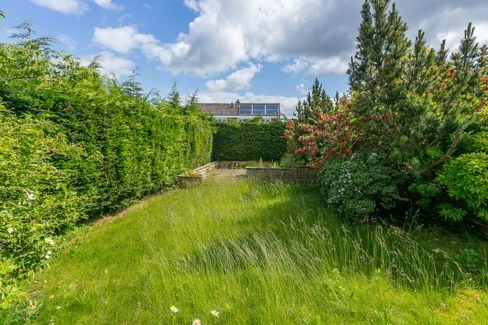 • Externally, there is tall privacy hedging, a lawn and driveway to the front, whilst the rear garden includes a lawn, patios and a store shed.