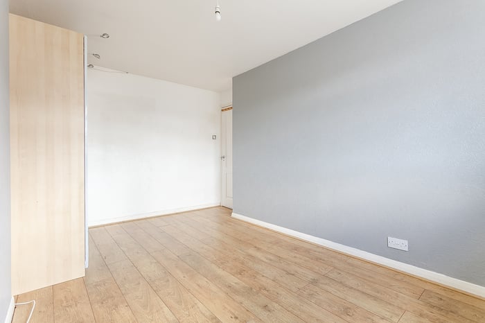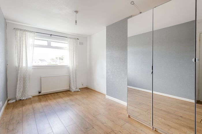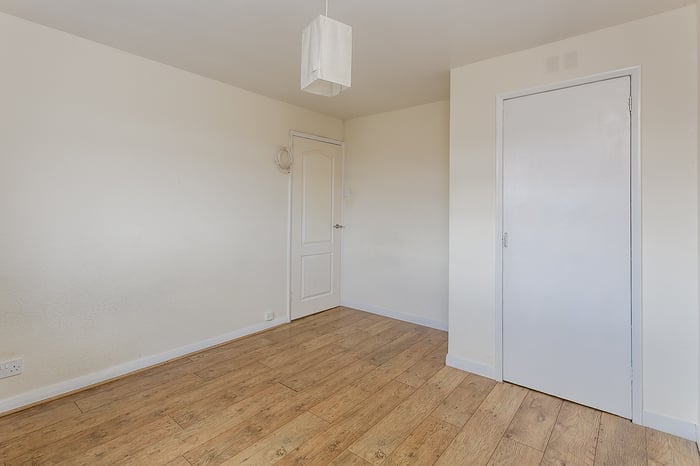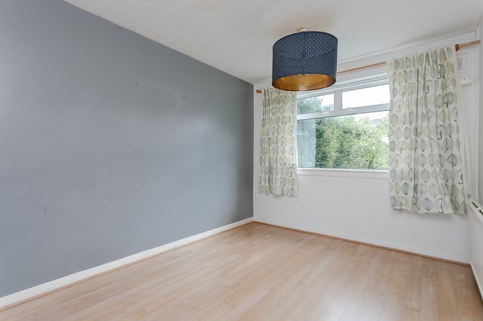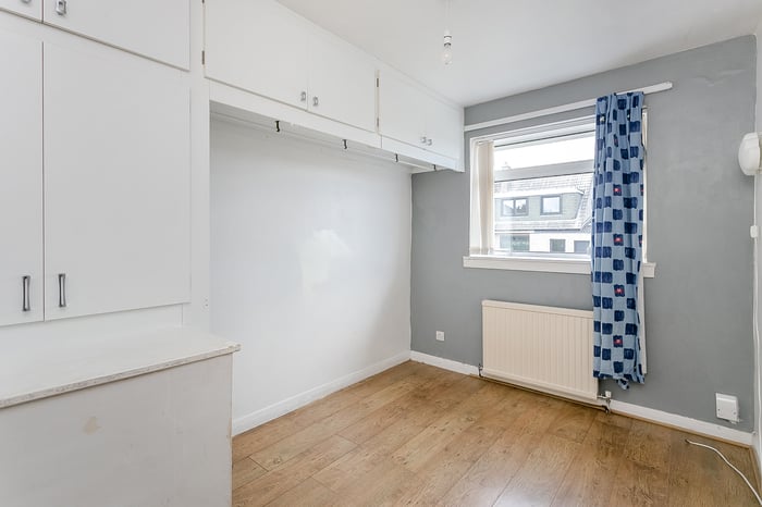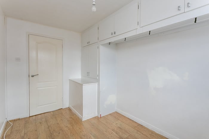 Bedroom two, set to the rear, features laminate flooring and a generous built-in storage cupboard. The third bedroom, a single, is located to the front and is ideal as a child’s room, study, or home office.