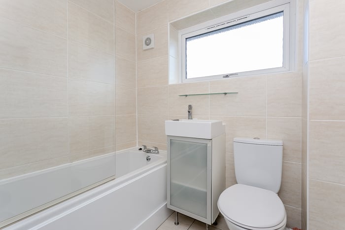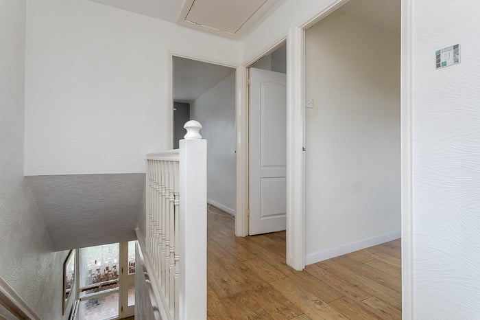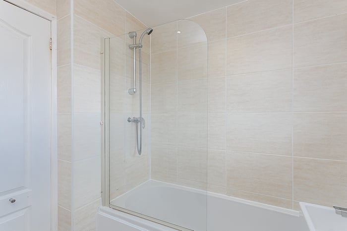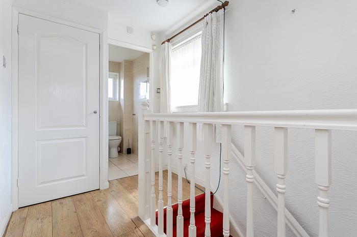 The upstairs hallway also benefits from a built-in cupboard, providing additional storage. Completing the property, a modern three-piece fitted bathroom offers a tiled splashback surround, tiled-effect flooring, a shower over the bath, spotlighting and a ladder-style radiator.