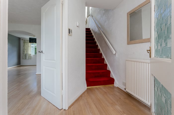 Well presented and spacious, three ­bedroom, semi-detached family home, with gardens, a driveway and an adjoining garage. This well-proportioned three-bedroom property offers bright interiors, a practical layout, and a private rear garden—ideal for families, first-time buyers, or those looking to upsize. The home opens with an entrance vestibule leading into a central hallway, where carpeted stairs provide access to the first floor.