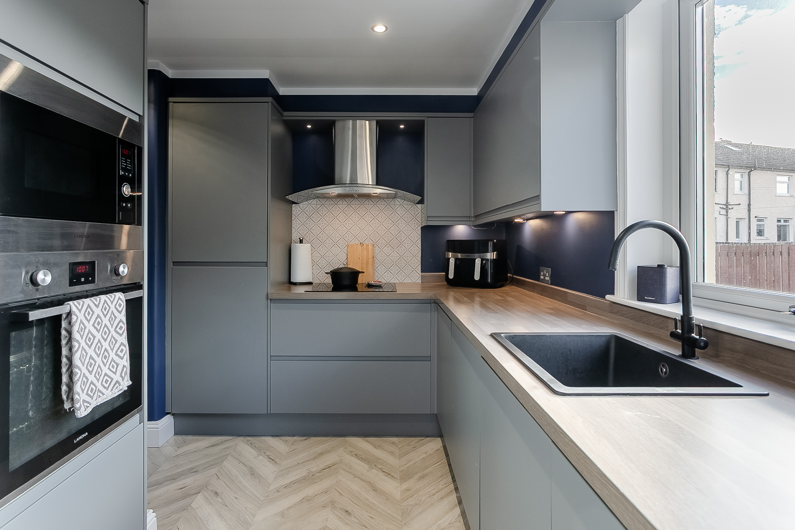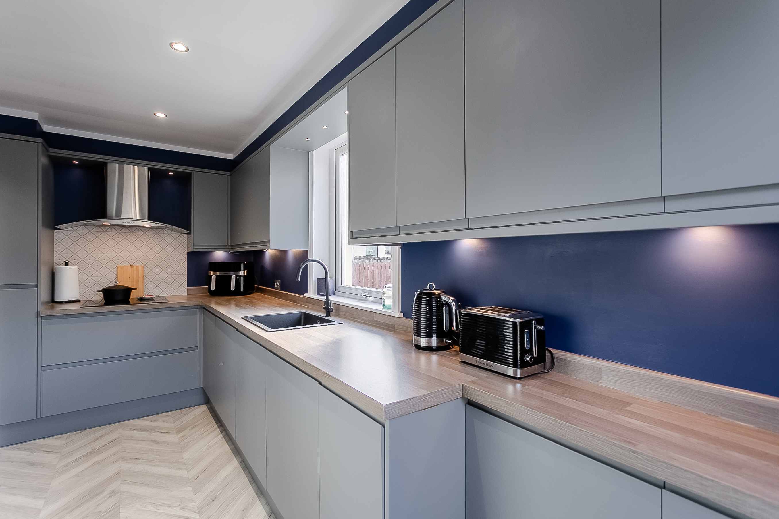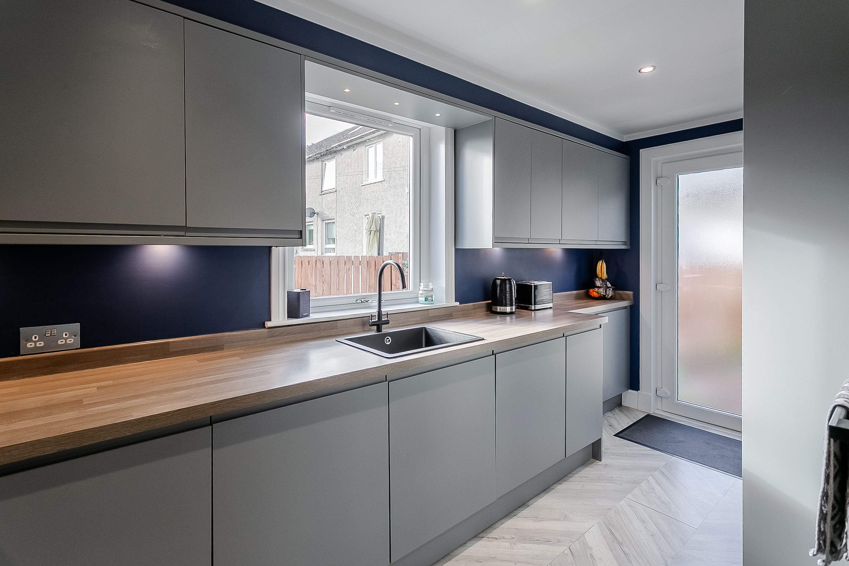 The open layout provides an ideal setting for both relaxing and entertaining, with ample room for a dining area and comfortable lounge furniture. Adjacent to the living room, the modern fitted kitchen boasts laminated flooring, stylish wood-effect worktops, spotlighting and under-cabinet lighting for a warm and contemporary feel.