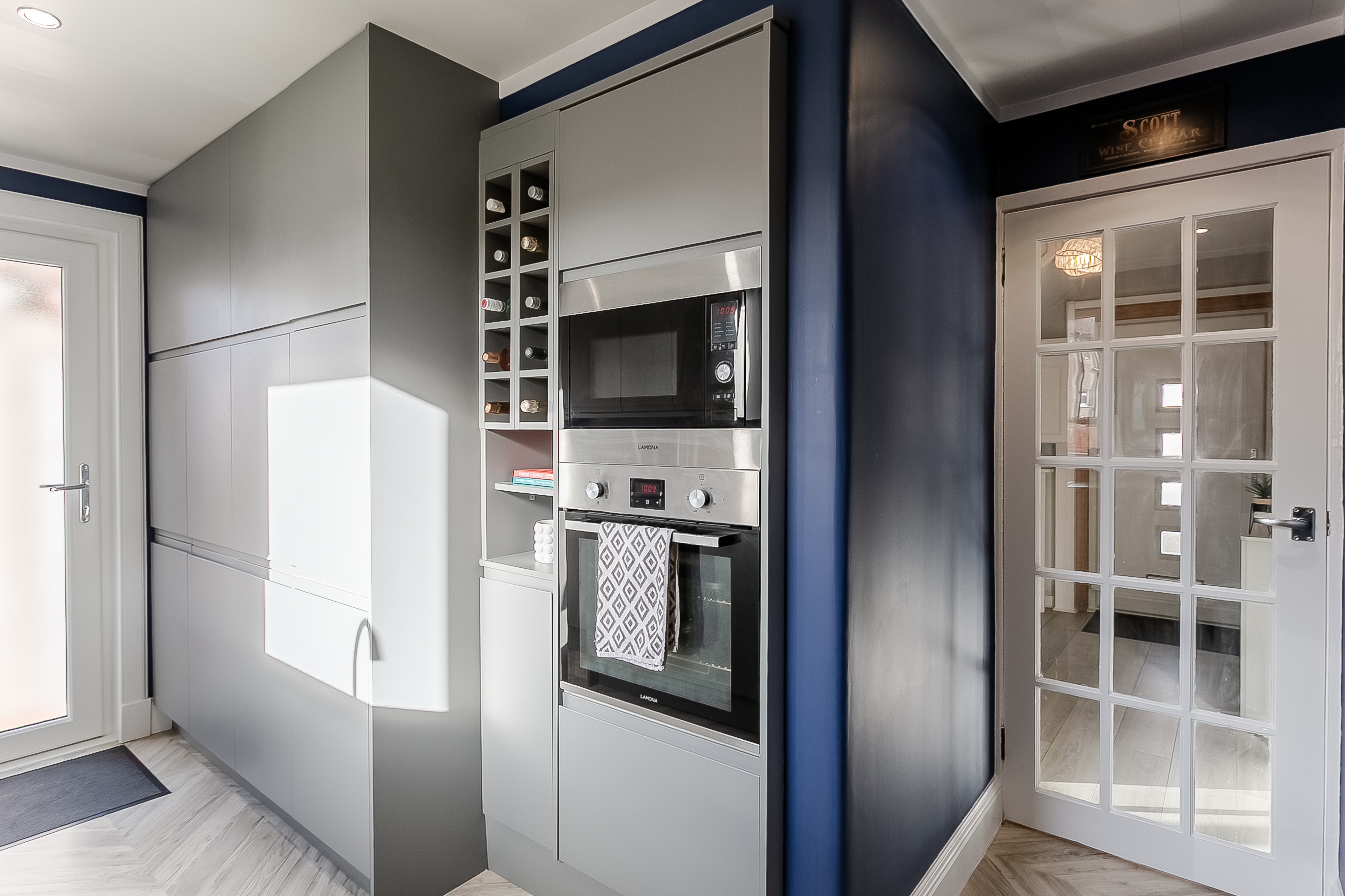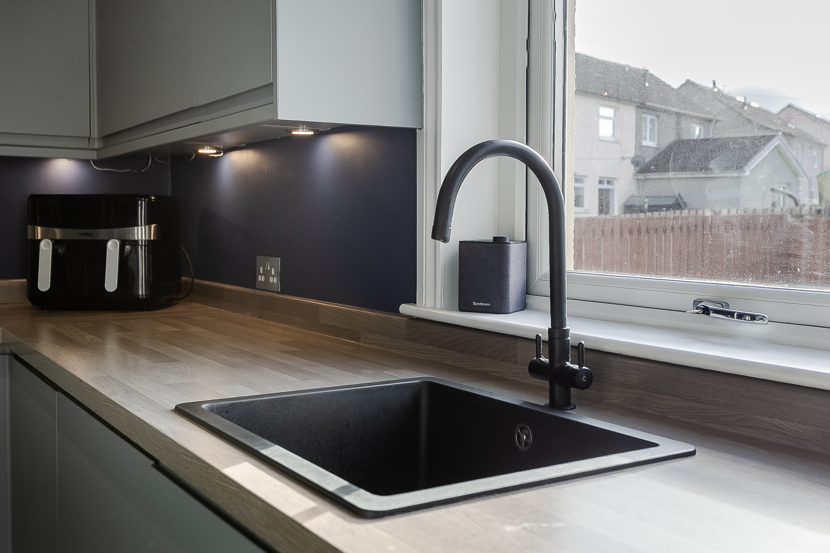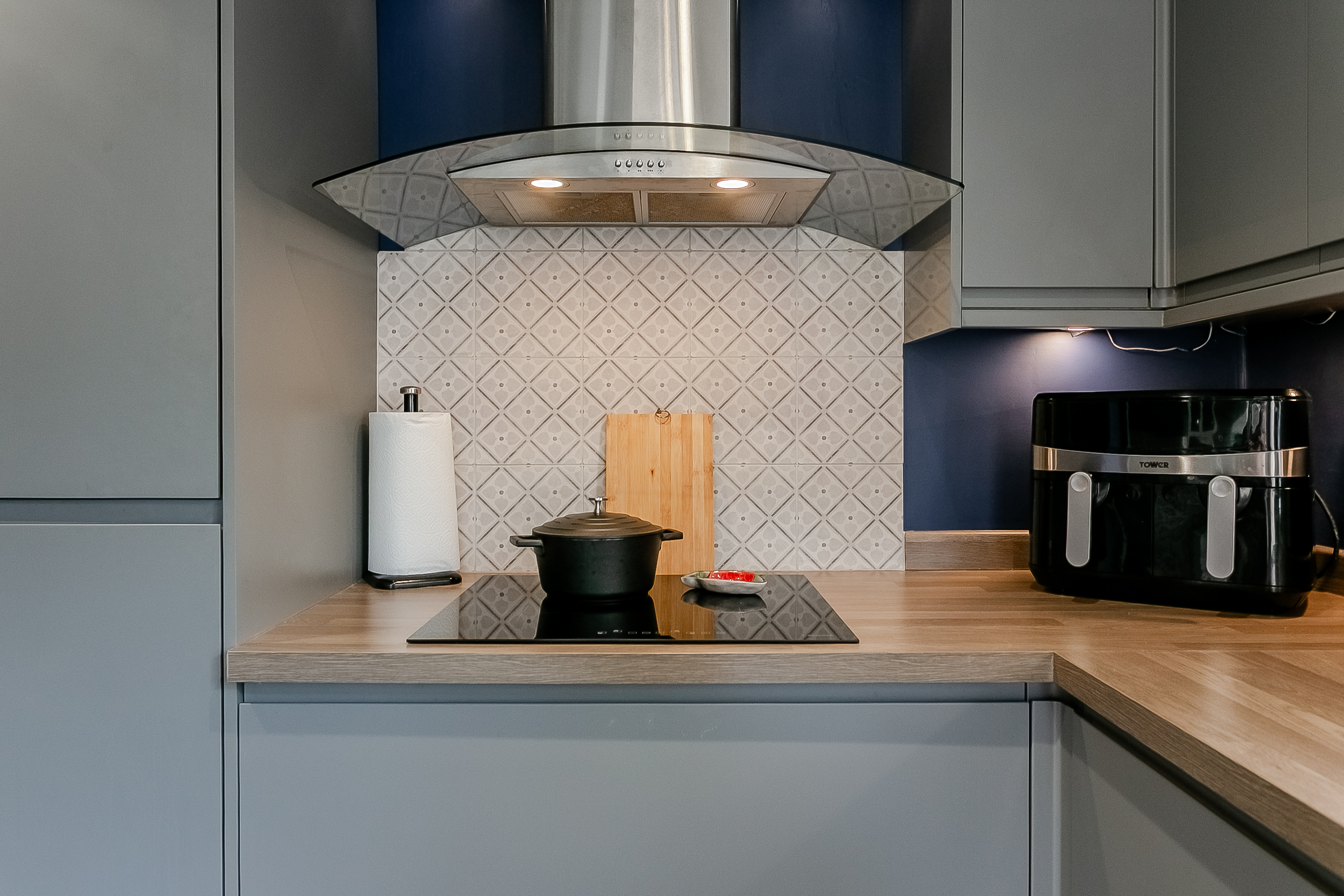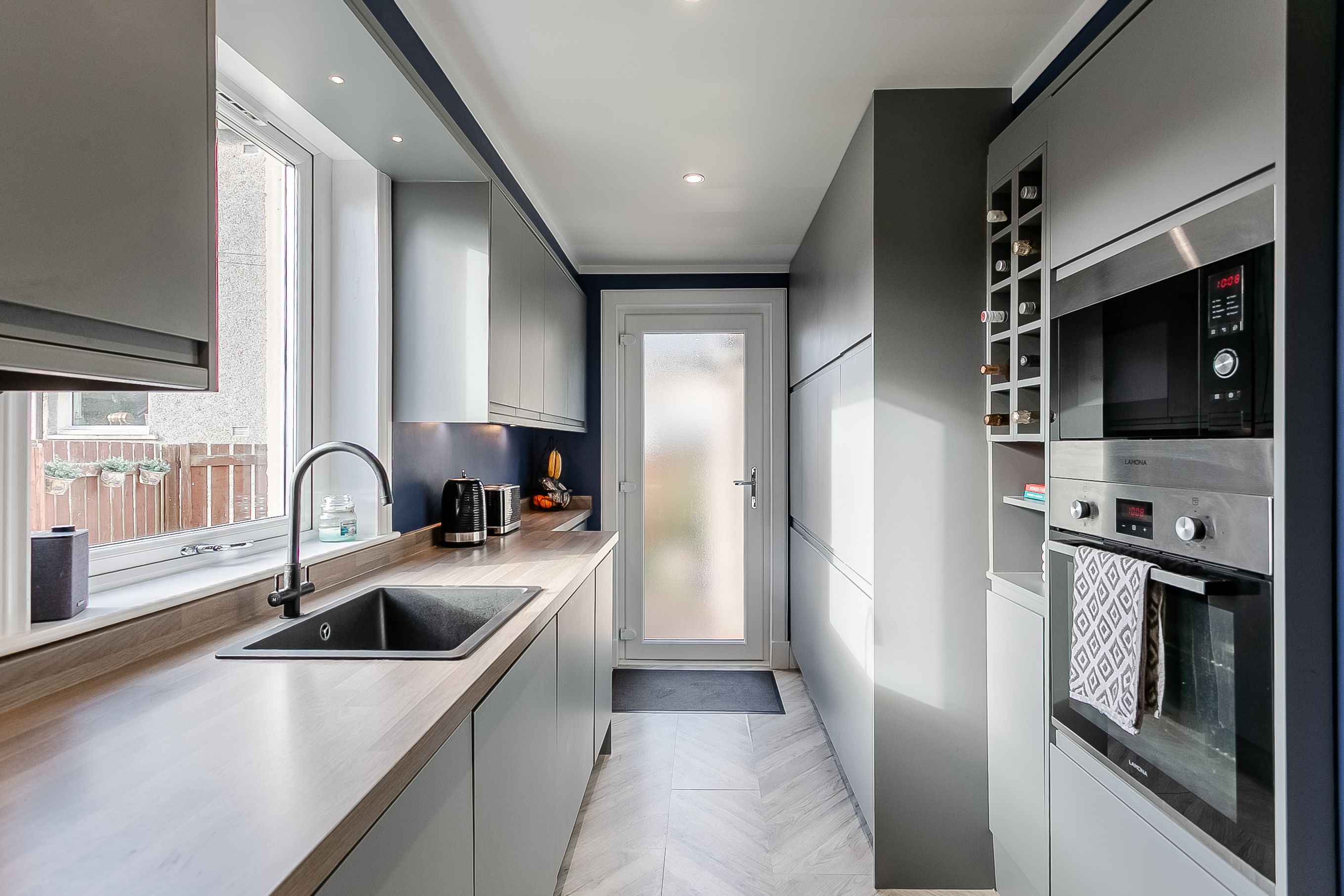 The open layout provides an ideal setting for both relaxing and entertaining, with ample room for a dining area and comfortable lounge furniture. Adjacent to the living room, the modern fitted kitchen boasts laminated flooring, stylish wood-effect worktops, spotlighting and under-cabinet lighting for a warm and contemporary feel.