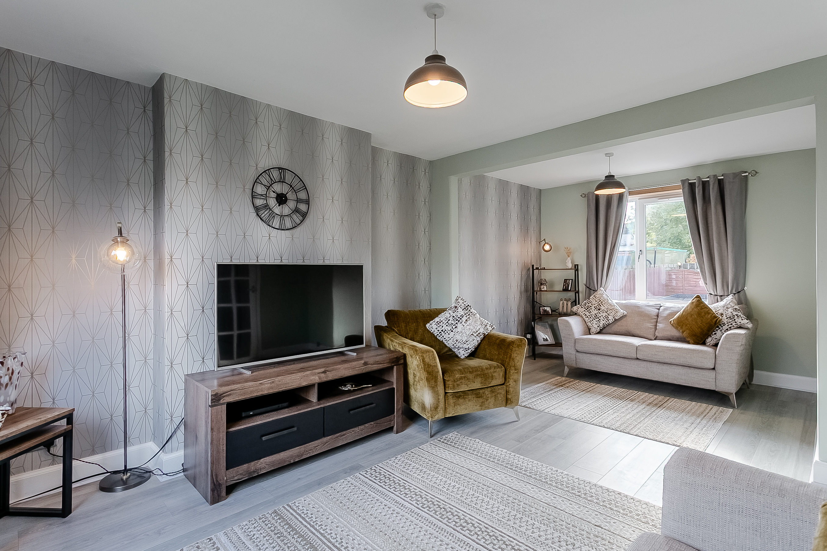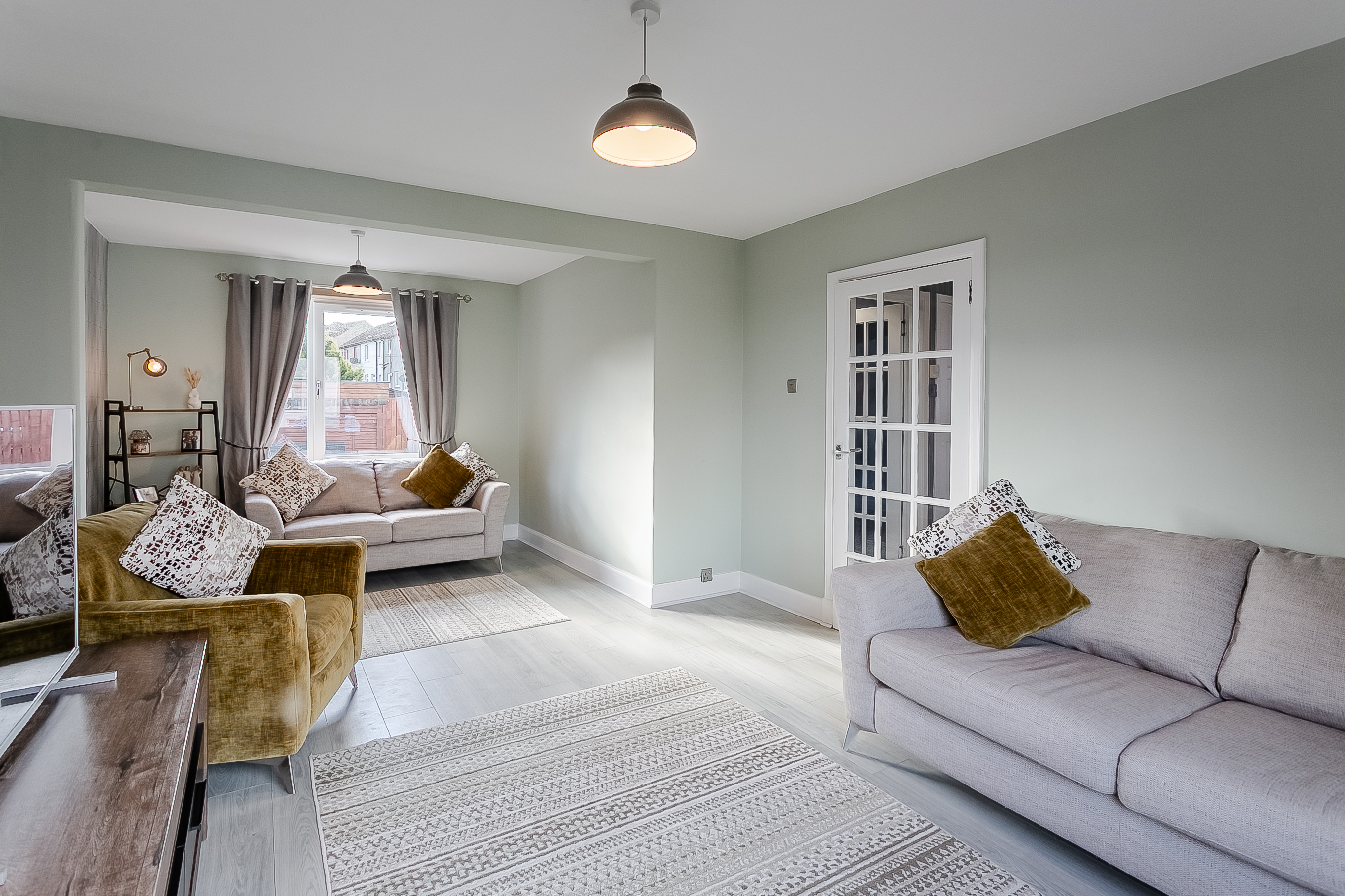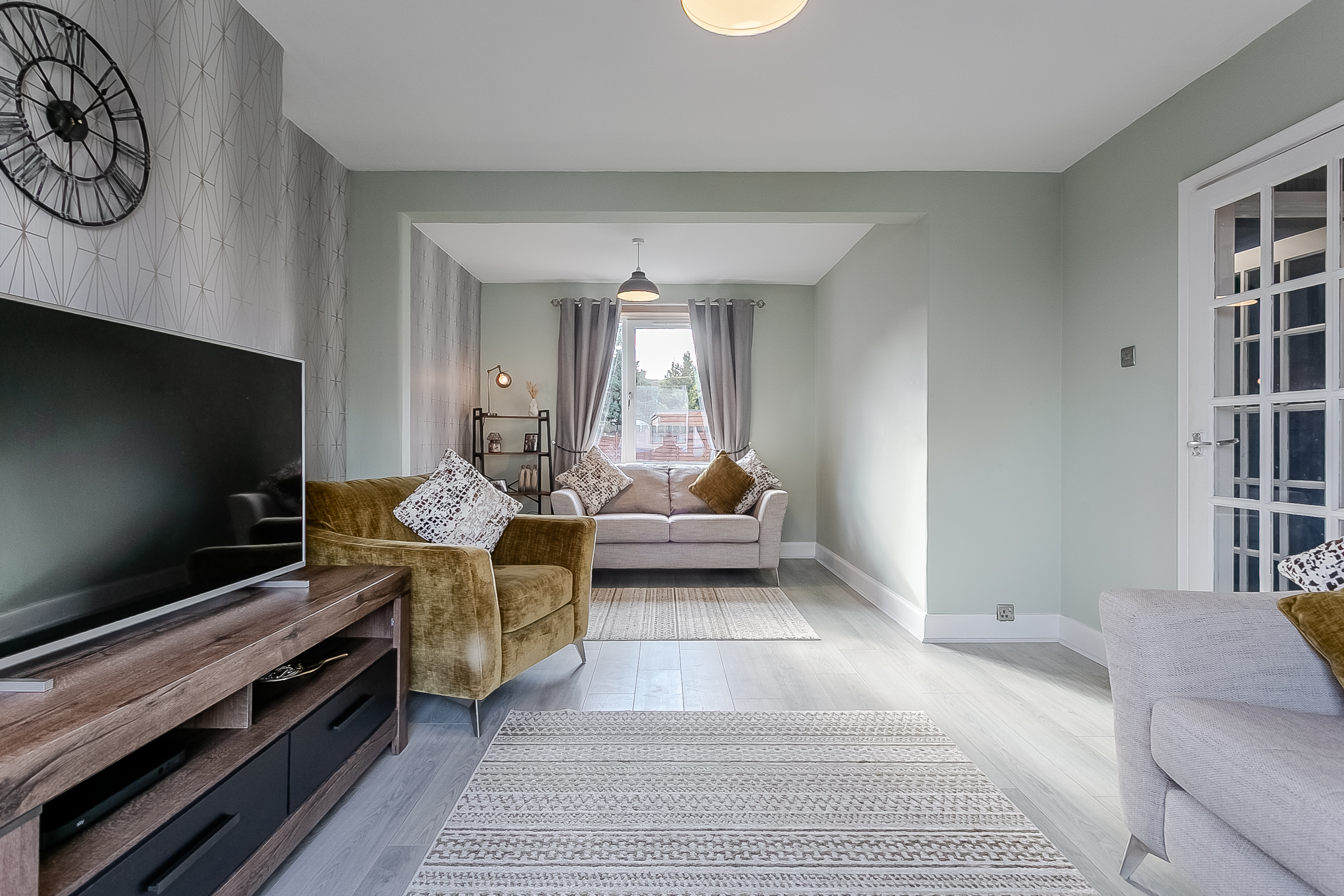 A bright and spacious entrance hall welcomes you into this beautifully presented home, offering access to all ground-floor rooms. The generously sized living and dining room is a true highlight, featuring attractive wood-effect flooring, elegant central light fittings and large windows that flood the space with natural light.