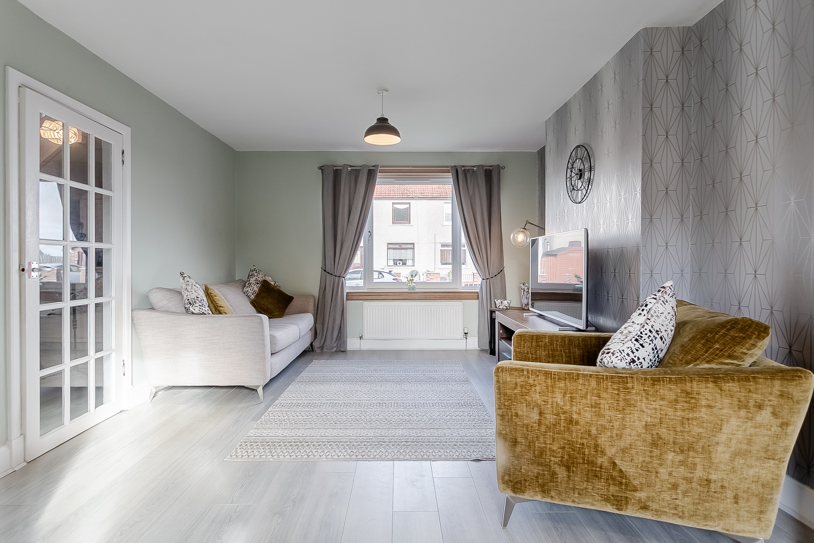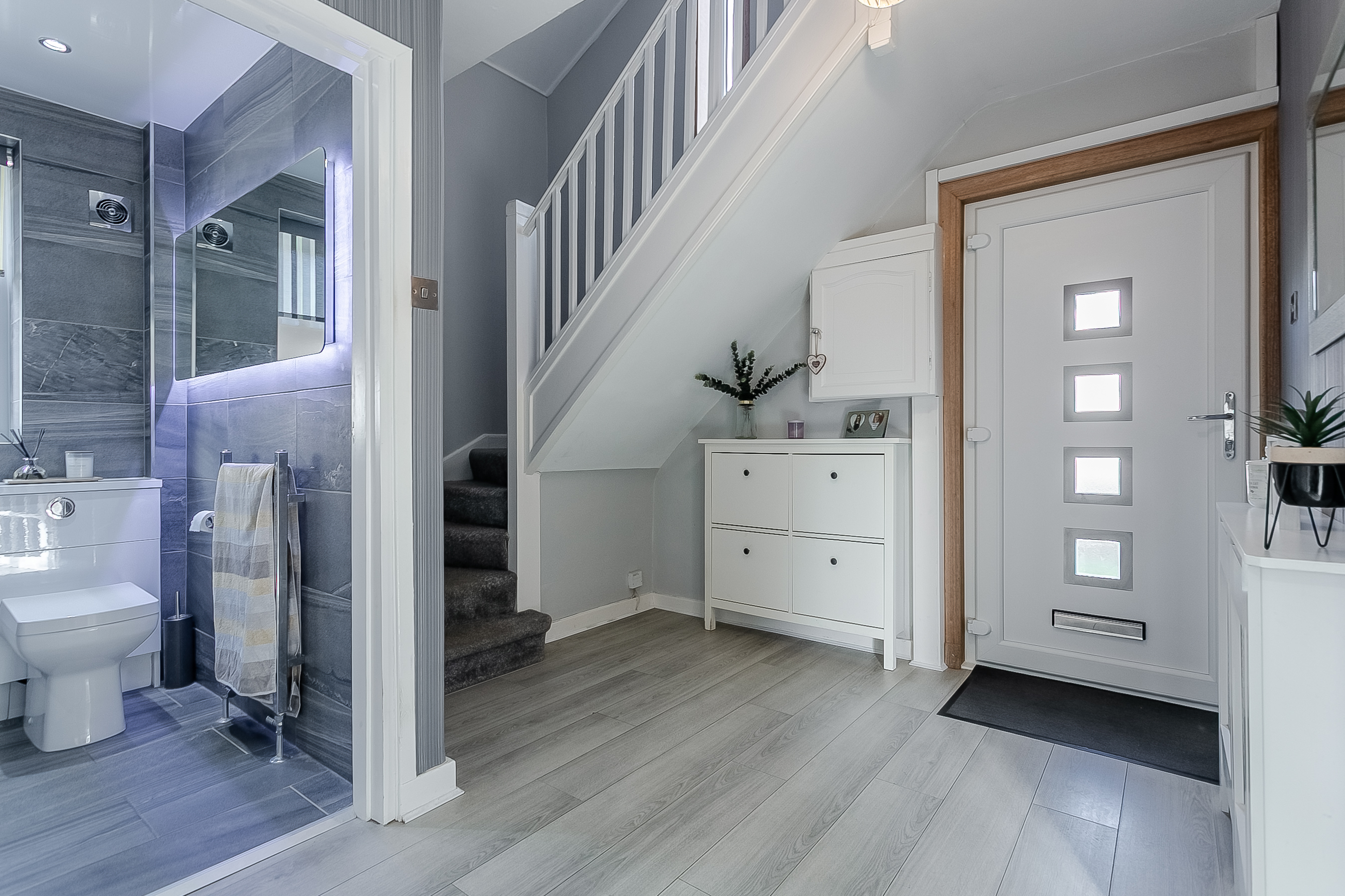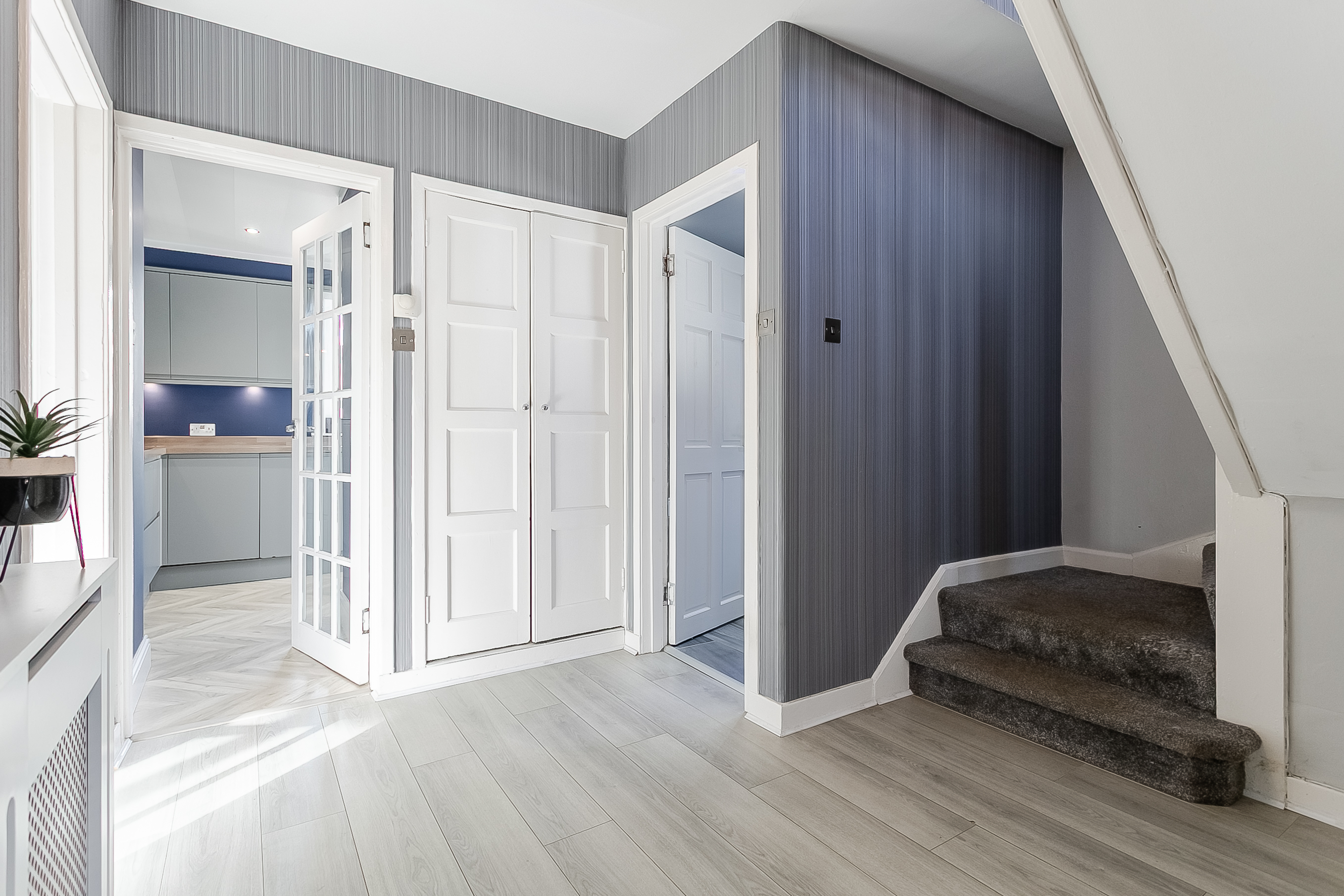 A bright and spacious entrance hall welcomes you into this beautifully presented home, offering access to all ground-floor rooms. The generously sized living and dining room is a true highlight, featuring attractive wood-effect flooring, elegant central light fittings and large windows that flood the space with natural light.