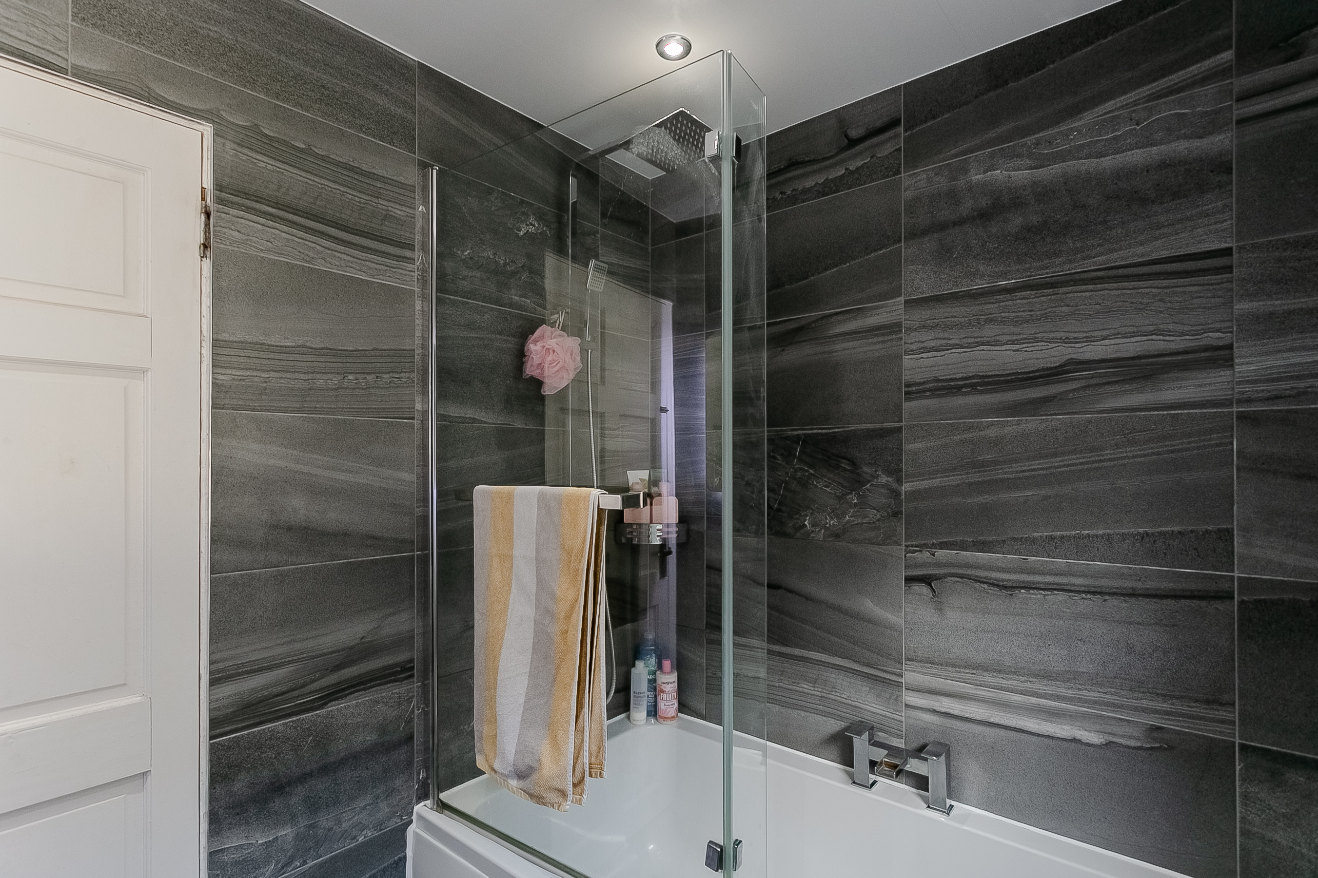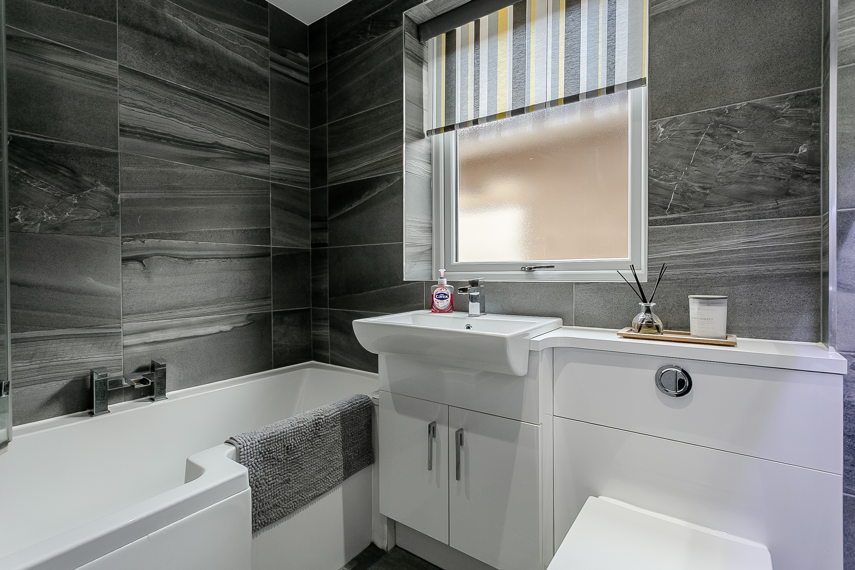 Integrated appliances include a washing machine, dishwasher, fridge/freezer, oven and electric hob with a sleek canopy extractor. The modern family bathroom is finished to a high standard, featuring tiled flooring, a tiled splashback surround, contemporary spotlighting, an LED mirror, a rainfall showerhead over the bath and a ladder-style radiator.