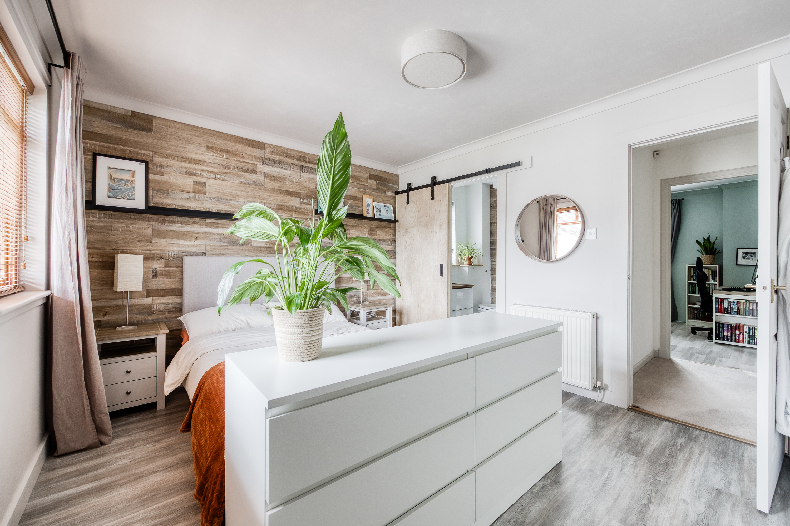 Upstairs, the principal bedroom is a peaceful retreat featuring a striking feature wall, wood-effect flooring and a contemporary en-suite shower room accessed via a stylish wooden sliding door. Three further double bedrooms, all tastefully decorated and fitted with matching wood-effect flooring, provide ample space for family members or guests.