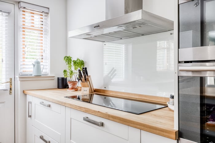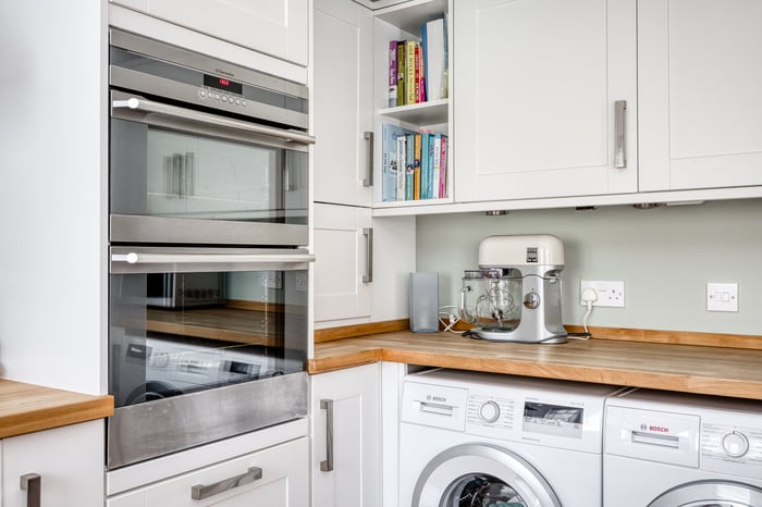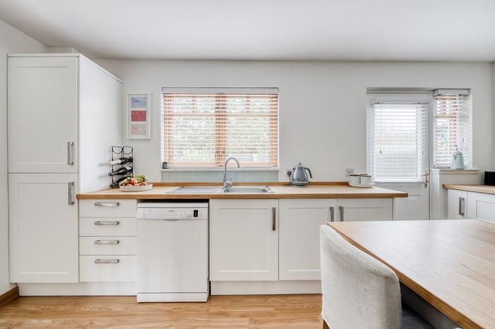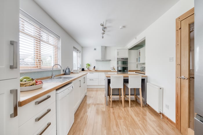 The modern fitted kitchen is designed with both functionality and style in mind. It features sleek wood-effect worktops, a practical breakfast bar, tiled splashback surround and a stainless steel sink with drainer.