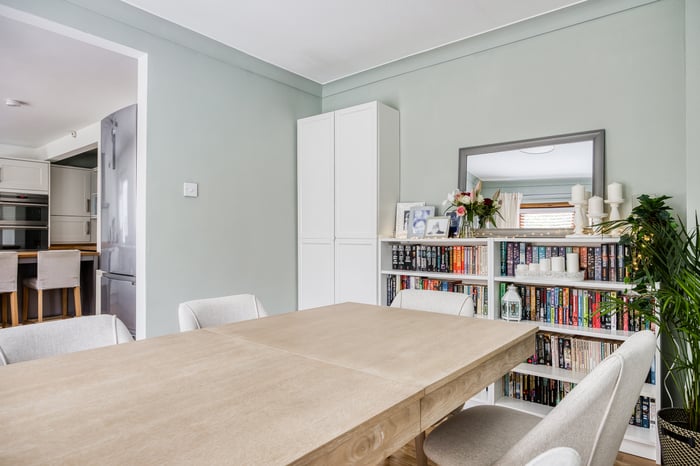 Integrated appliances include a double oven and an electric hob with a canopy extractor above. The kitchen flows seamlessly into the dining area, where patio doors open directly to the rear garden, creating an ideal space for indoor-outdoor dining and entertaining.