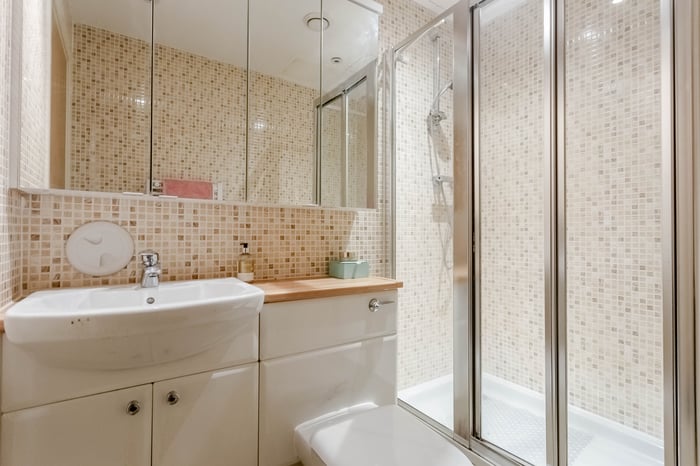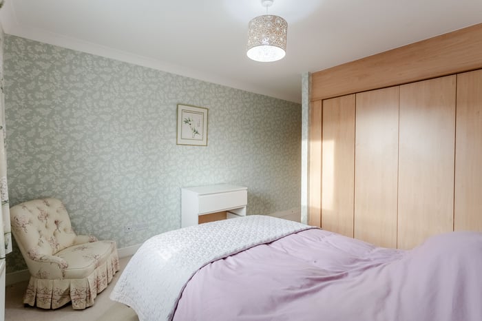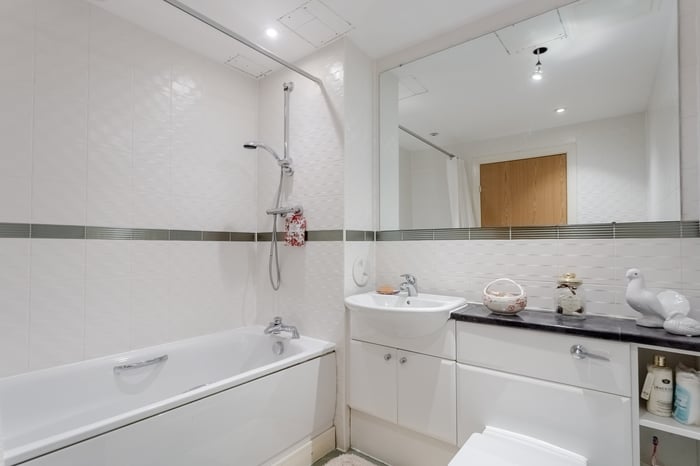 Both bedrooms are finished with carpeted flooring and light décor, featuring built-in cupboards ideal for storage, while the master bedroom also benefits from an ensuite shower room with a ladder-style radiator. Completing the property is the family bathroom, presented as a three-piece suite with a shower over the bath.