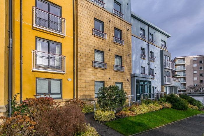 Light, tastefully presented and spacious, two-bedroom, south-facing ground-floor apartment, with an allocated parking space. Forming part of an exclusive, modern residential development in the highly sought-after area of Barnton, north-west of Edinburgh’s city centre. A welcoming entrance provides access to all rooms, and at the end of the hall, the living/dining room features contemporary flooring throughout, complemented by an open-plan kitchen that makes the space both functional and convenient, especially for entertaining guests, with curtains and blinds included along with all light fittings.