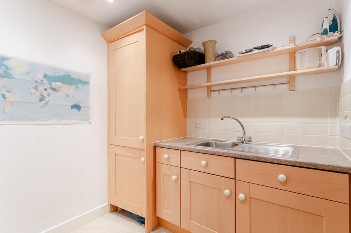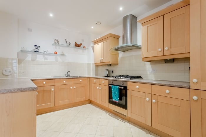 The kitchen is finished with a granite-effect worktop, a stylish splashback, a sink with drainer, and integrated appliances including an oven, five-ring gas hob with canopy above, dishwasher, and fridge/freezer. Towards the front of the property, there is also a convenient utility room with an additional sink and drainer and useful storage space.