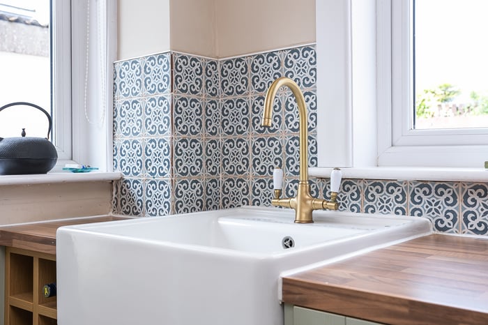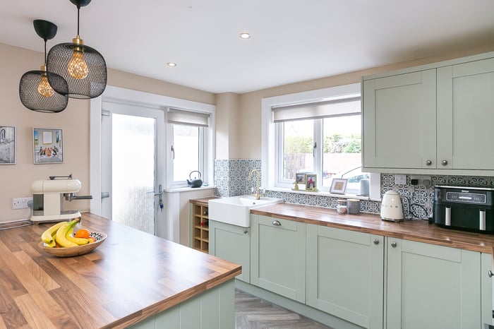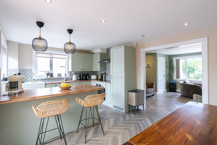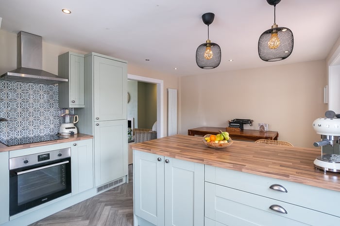 Including a breakfast bar and space for a dining table and chairs, the kitchen is fitted with traditional units, wood-effect worktops and a Belfast sink, whilst appliances include an integrated oven, an induction hob, a stainless-steel canopy, a fridge/freezer and a dishwasher. Leading off the kitchen, a conservatory offers further, versatile living space.