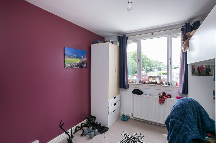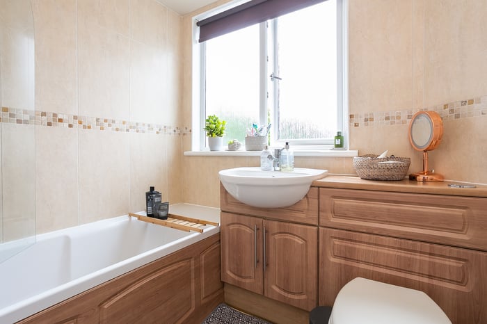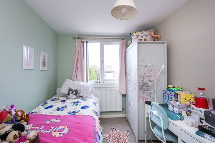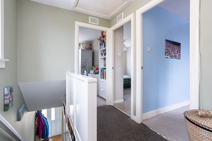 Upstairs, set to either aspect, three carpeted bedrooms provide good-sized, versatile spaces, with one benefiting from built-in cupboard storage. Completing the accommodation, a family bathroom comprises a three-piece suite, a shower-over-bath, vanity storage, a chrome, ladder-style radiator and tiled splash walls and flooring.