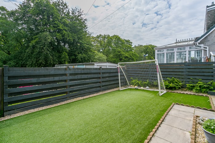 • Low-maintenance, professionally landscaped gardens include a patio and synthetic turf lawn to the rear, with a multi-vehicle driveway continuing to the side.