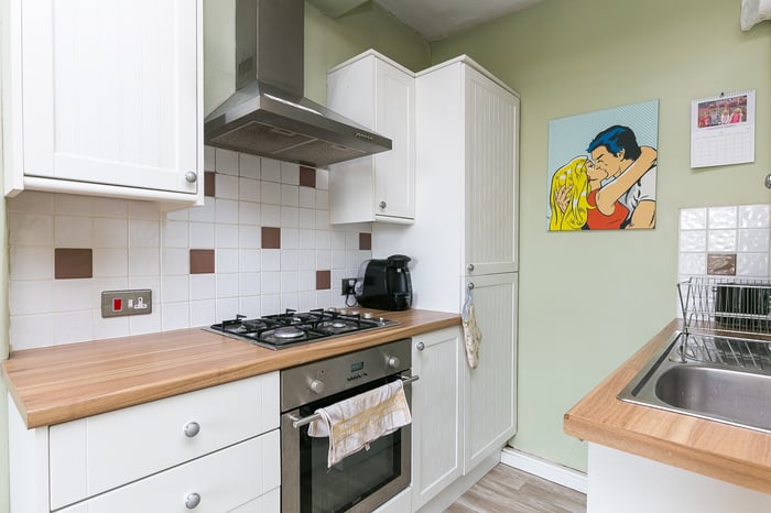 An open plan living area features carpeted flooring for the lounge, a fitted press cupboard housing the central heating system, TV and phone points and a central pendant light fitting. Set to the rear of the room, the modern fitted kitchen has wood-effect worktops, stainless steel sink with drainer, tiled splash-backs, washing machine and an integrated fridge/freezer, oven, gas hob and canopy.