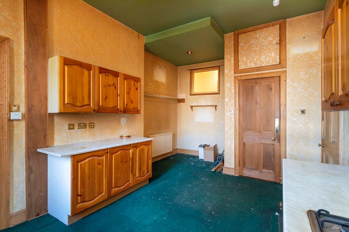 Set to the opposite aspect, a generously proportioned kitchen, with space for seated dining, is fitted with traditional, wood-effect units, marble-effect worktops and splashback tiling. The kitchen includes an integrated oven, a gas hob and a concealed extractor fan, whilst an adjoining utility room houses additional units and a freestanding washing machine.