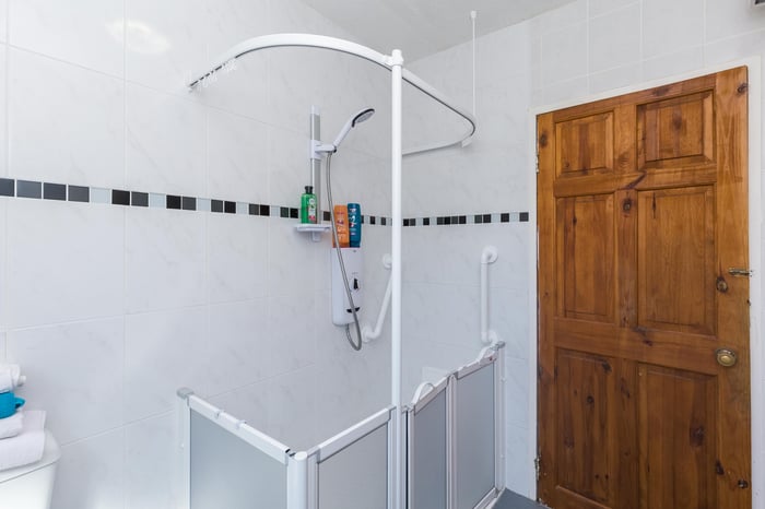 Completing the accommodation, the wet room style shower room has a rear-facing window and a two-piece suite, tiled splash walls and a walk-in style easy access shower.